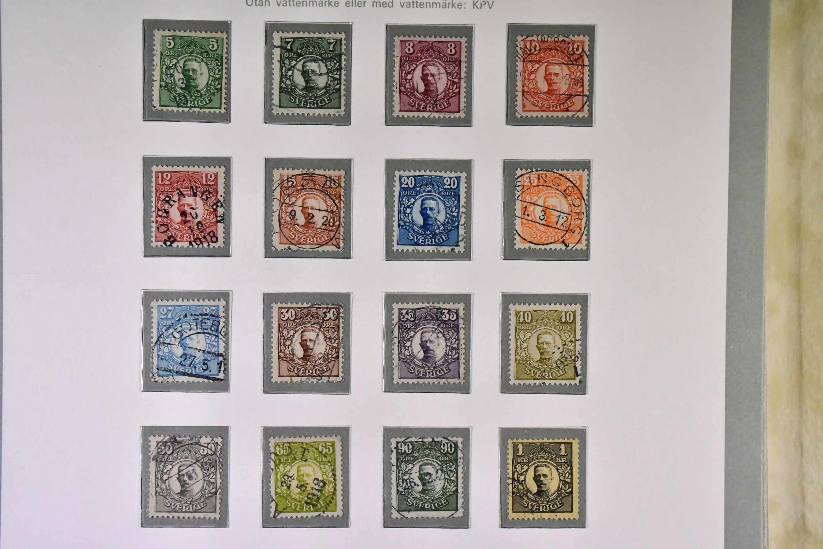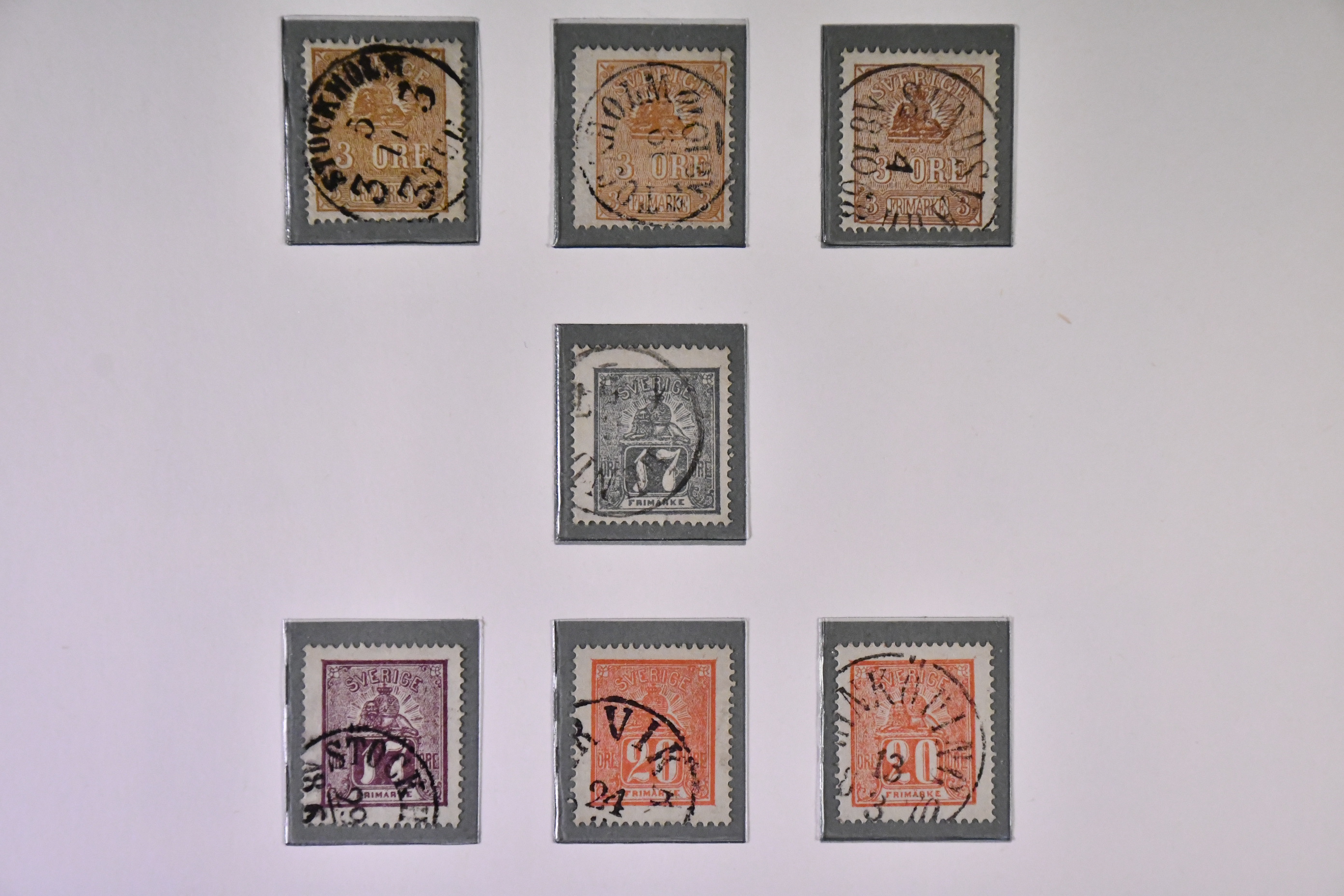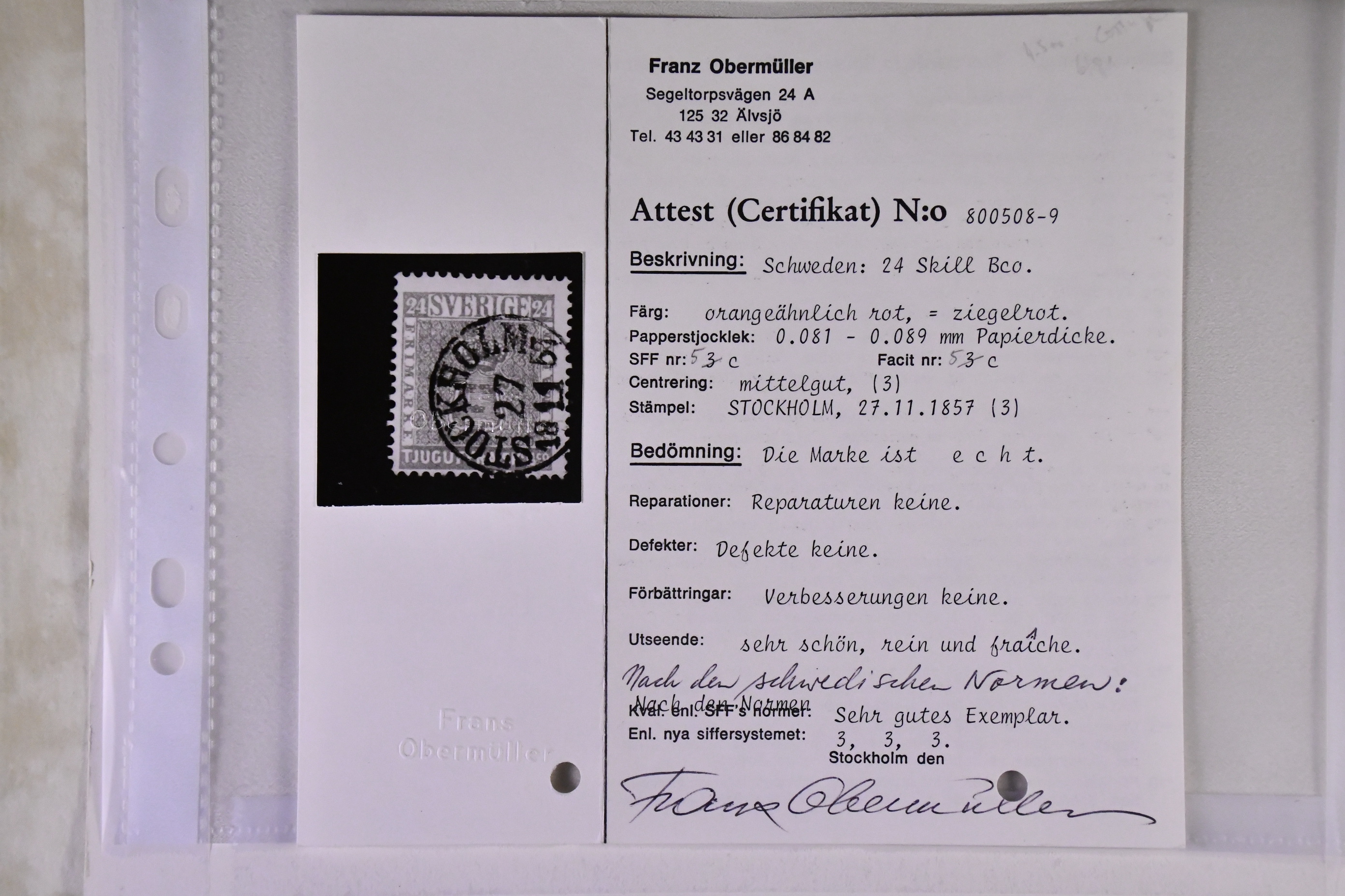 Sweden. Collection used 1855–1936 in album. Over complete (except F92 and 94) – the classic part often in several copies incl. different shades e.g. 4 Skill Bco in 17 copies, F15c and coil stamps with different wmks e.g. F175Acx. Also officials, postage dues and military reply-stamps. Many beautiful stamps. Six certificates are included. Mostly good quality.