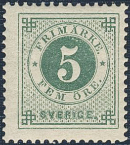 Sweden. Facit 43d ★★, 5 öre dark green on yellowish paper. Very fine. SEK 1500
