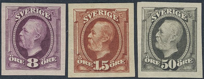 Sweden. Facit 51, 55, 59v1 ★, 8, 15 and 50 öre. Three imperforated copies incl. 50 öre with minimal thin spot. SEK 6600
