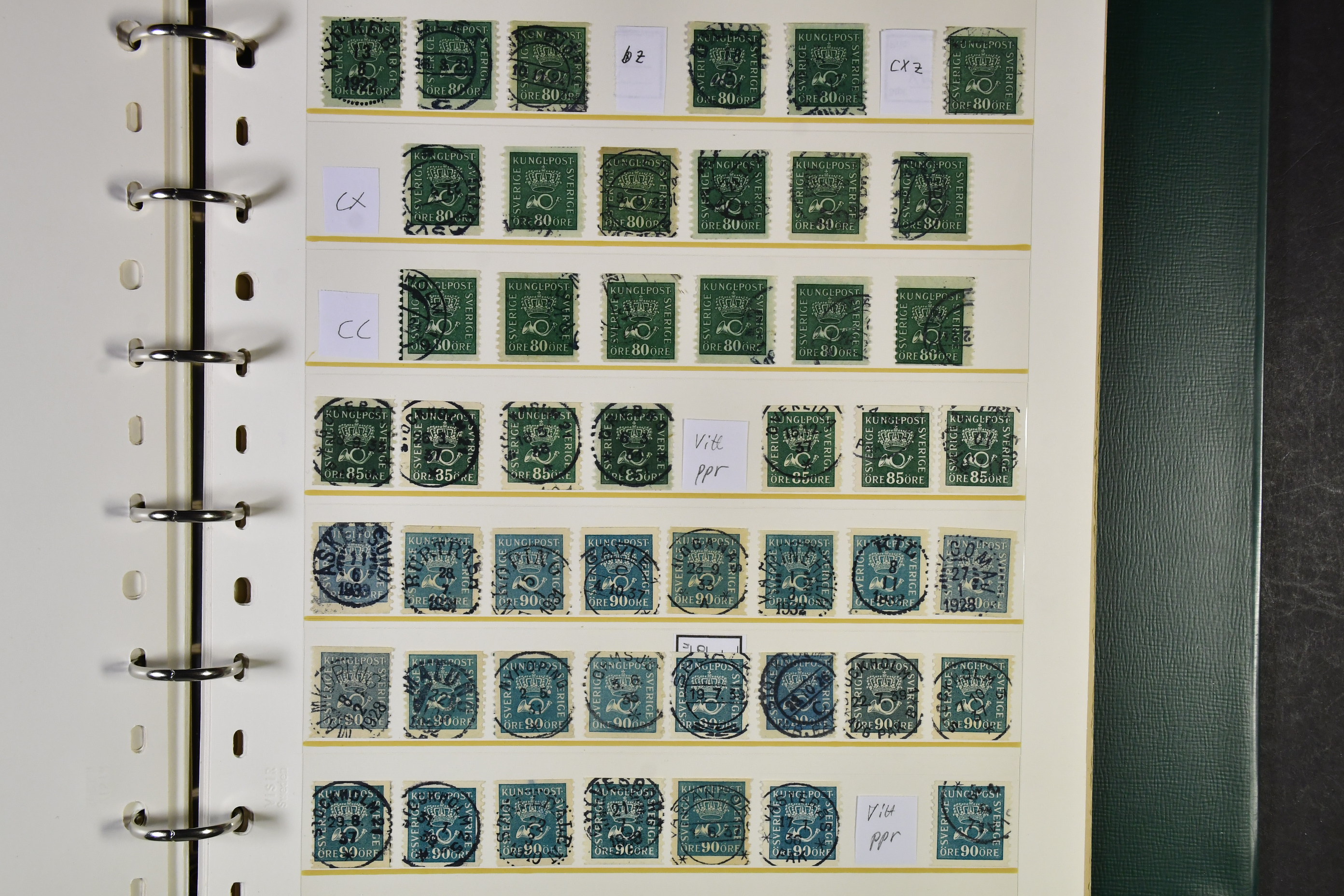 Sweden. Collection/accumulation used 1920–1935 in visir album. Coil stamps – Standing Lion, Crown and Posthorn, King Gustaf V left profile. Includes shade varieties, paper varieties, different watermarks and a number of fine to superb cancellations. Low reserve. Please see a selection of scans at www.philea.se. Good quality. (>1000)