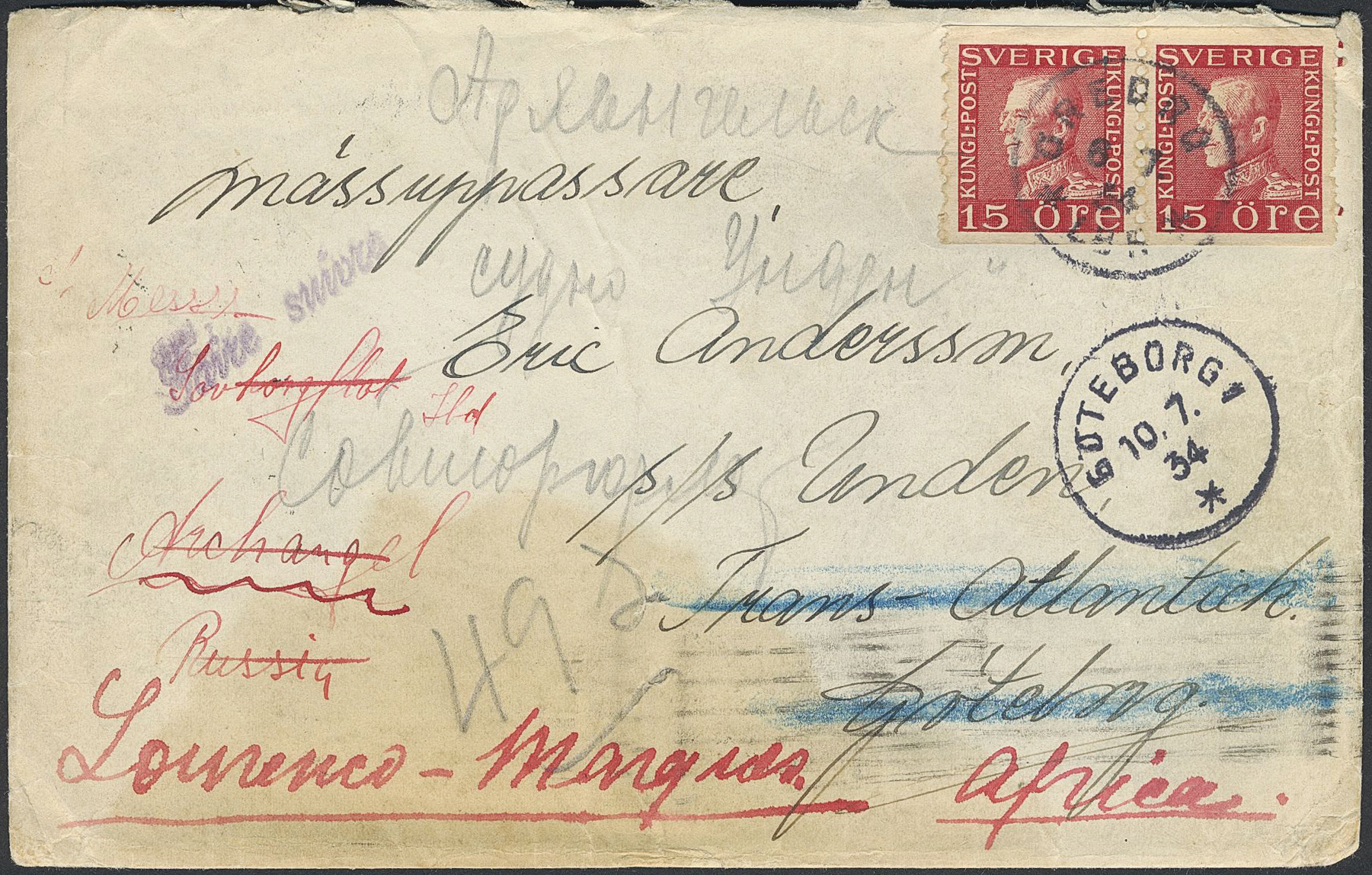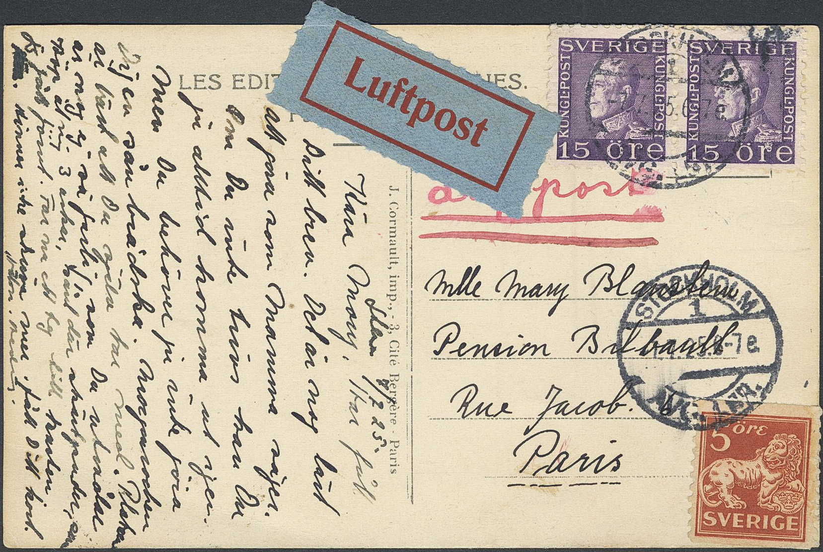 Sweden. Collection covers 1882–1938 on visir leaves. Nice mix of better usages, 18 öre paid postage due, additional services, foreign destinations incl. Aruba, Curaçao and Lourenco Marques, etc. The entire lot is presented at www.philea.se. Somewhat mixed quality. (10)