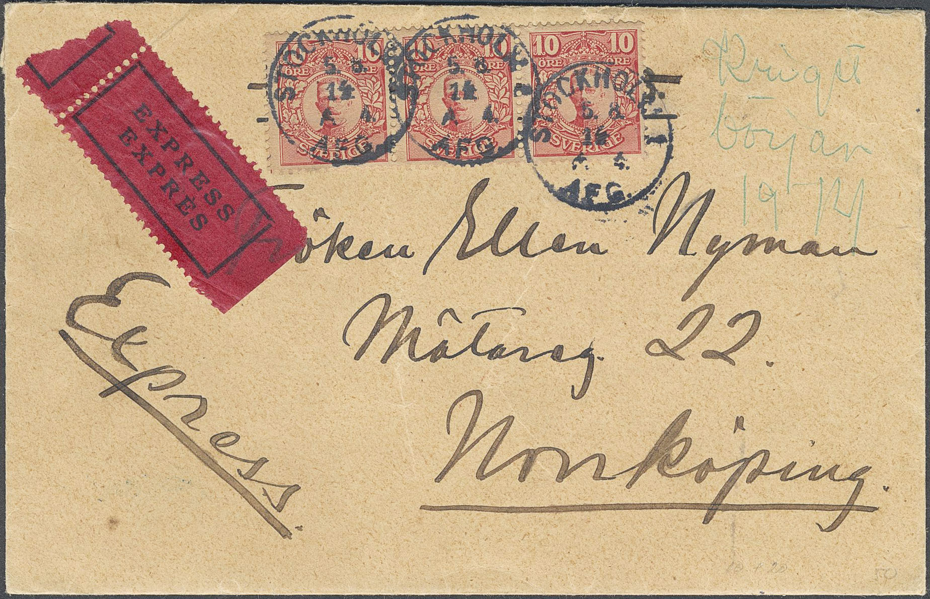 Sweden. Collection covers SPECIAL DELIVERY 1906–1942 on visir leaves. Combinations, together with other additional services, different labels, censor, etc. The entire lot is presented at www.philea.se. Somewhat mixed quality. (14)