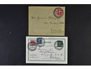 Sweden. Lot covers 1897–1968. Postal stationery (bKe7), special cancellatons 1897, picture postcard Stockholm Stadion 1912, incoming postcard with FRÅN FINLAND mark 1906, censored air mail cover to "Norwegian Arme Command" in London 1945 and a late usage of 2.12/5 kr (F98) on registered cover to London 1968. (8)