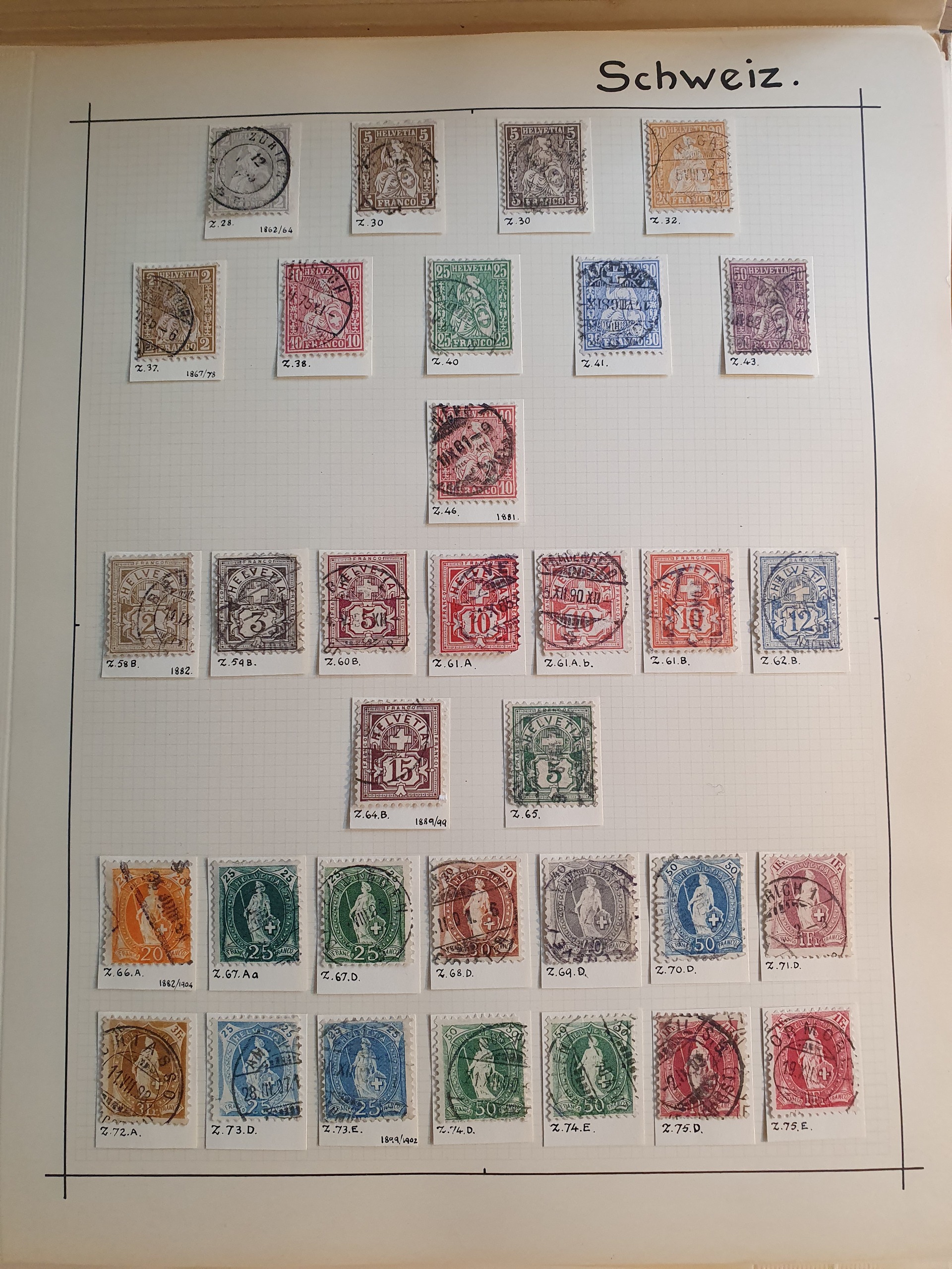 ALL WORLD. Collection/accumulation mostly used 1800s–1900s in box. In this assembley contains of a nice collection from Switzerland. One from Germany. Three albums from all the world. One set of leaves that contains all the world stamps, some of older types. This must be a bargain. Please see a selection of scans at www.philea.se. Mostly fine quality. Approx. 8 kg.