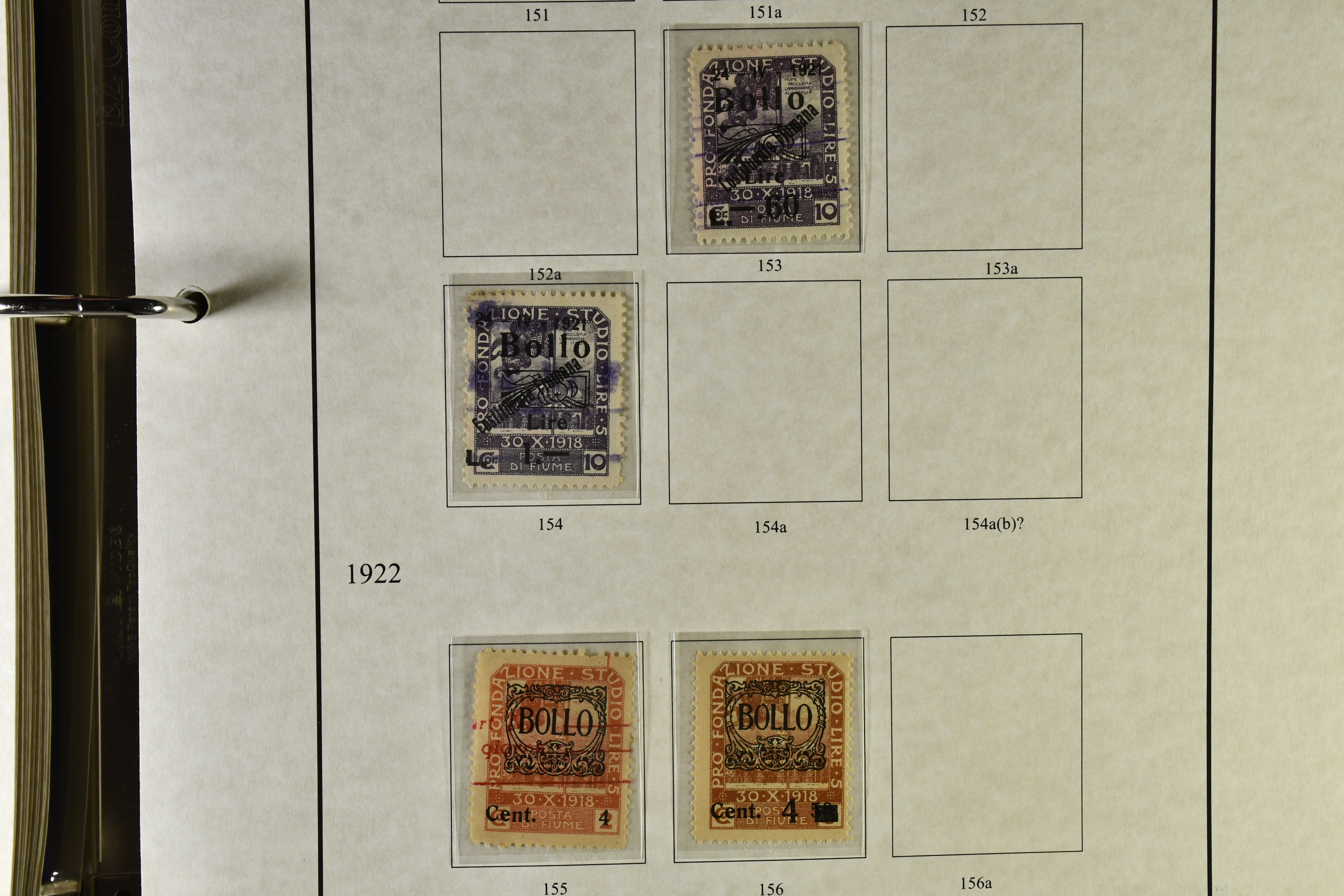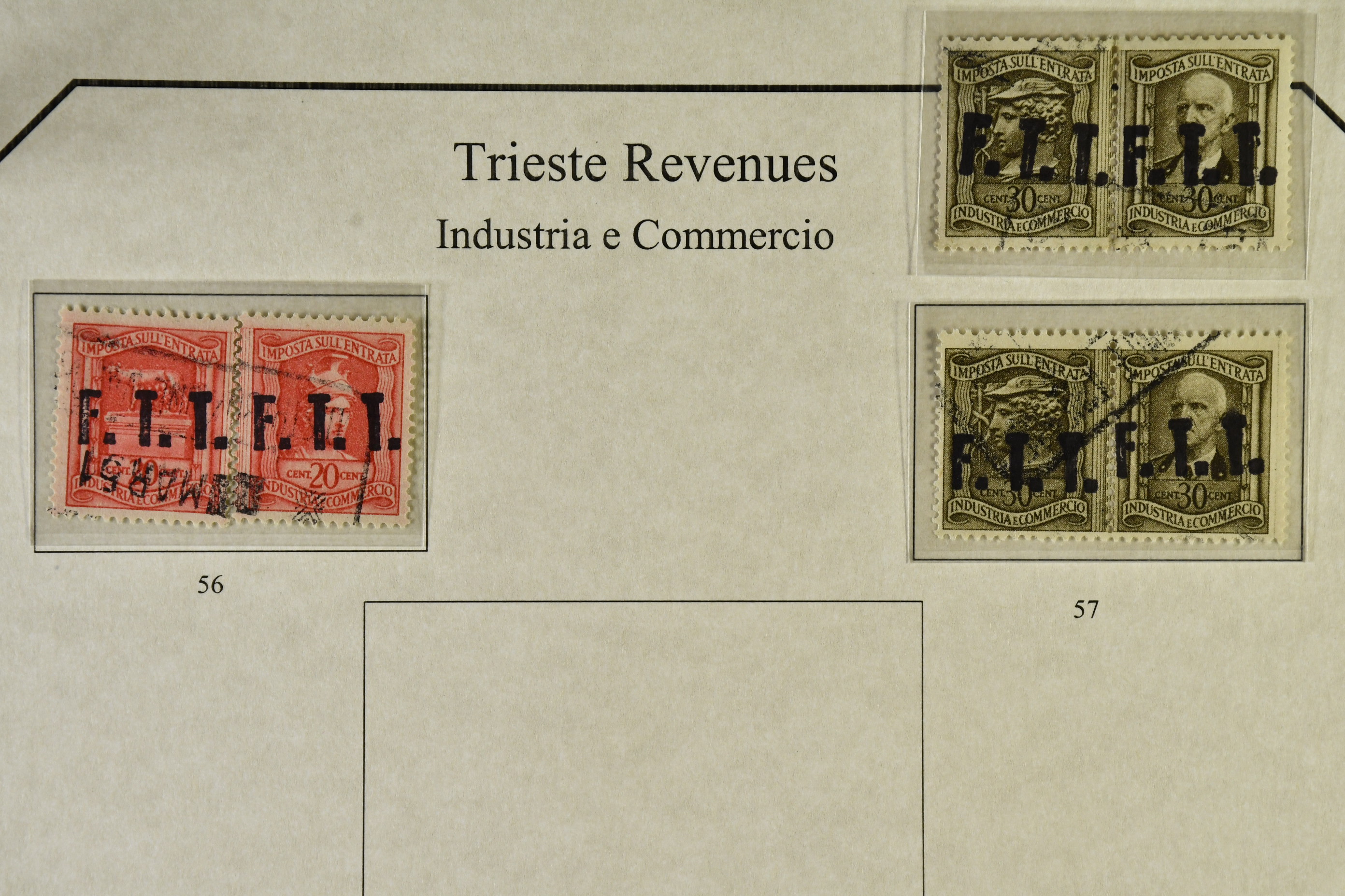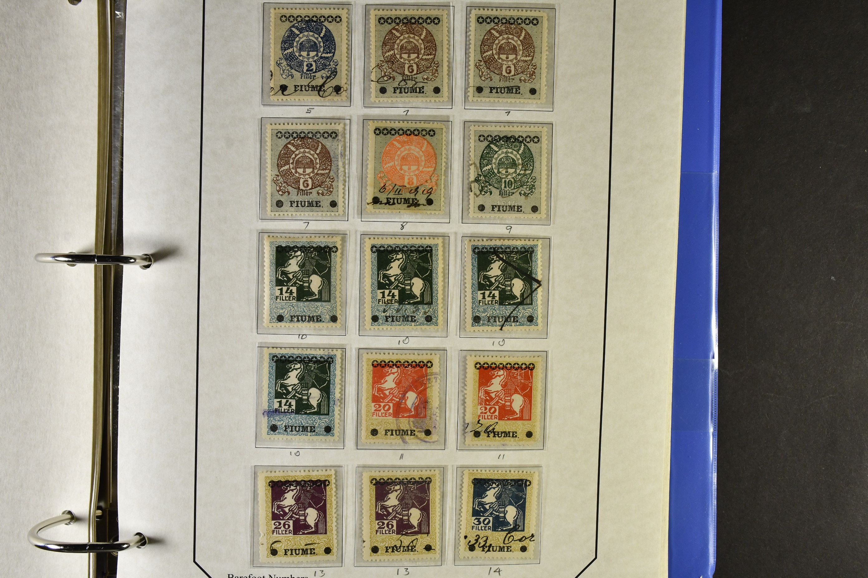 Italy. ★★/★/⊙. Specifically Fiume and Trieste, one man's life time collection of back of the book. Several 100s of stamps, housed in one thick album very well presented, written up, all one of a kind with much identified by Barefoot. Beginning with Fiume from the Croatian Occupation through to the Italian printings, then the 'Marco da Bollo' o/ps to further Fiume o/ps with different stars and watermarks, overprint errors, as well as other unlisted. Virtually every issue seen for any purpose for Fiume such as stock transfers, passports, municipals, even Istria, Kupa-Sudsk onto WW2 types, very seldom seen. Similarly with the Partisan Government issues of Susak and equally scarce Kupa issues inc multiple pairs particularly for excise duty. Then the 'Diritti D'Urgenza' Venezia Guila, on to the free territory of Trieste with inter-panneau pairs through to AMGs, again very well represented, seemingly complete. Also noted Bills of Exchange, cigarette papers, stock transfers se-tenants, security papers in pristine condition, further se-tenants including large pictorials through to Romulus types and on to yet further errors and varieties, nearly all of it MNH, followed by 'weights and measures' with dramatic horizontally misplaced o/ps with the distinct probability of unique items present. So much here to research than this outline description. This collection is important, some material is quite exceptional. A most enjoyable viewing awaits the collector or dealer looking for the different and very scarce, offered intact as received.
