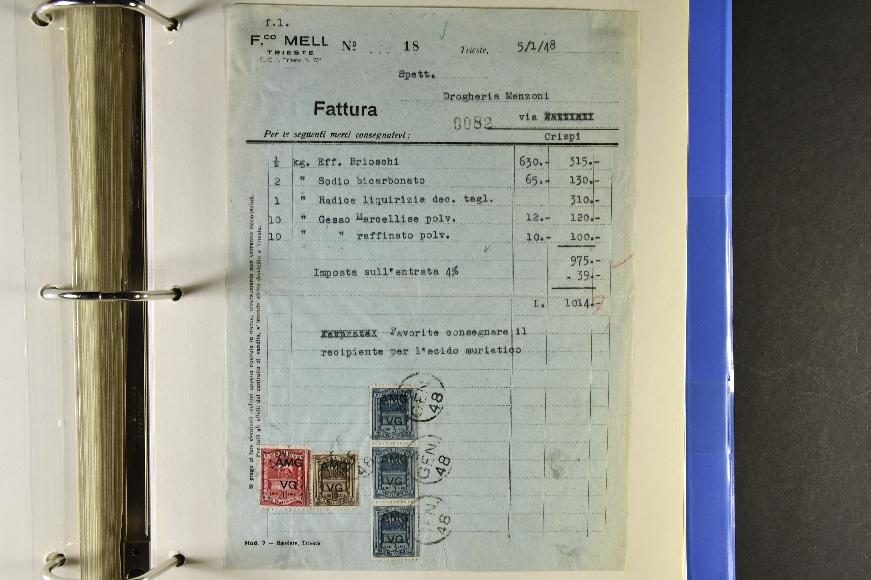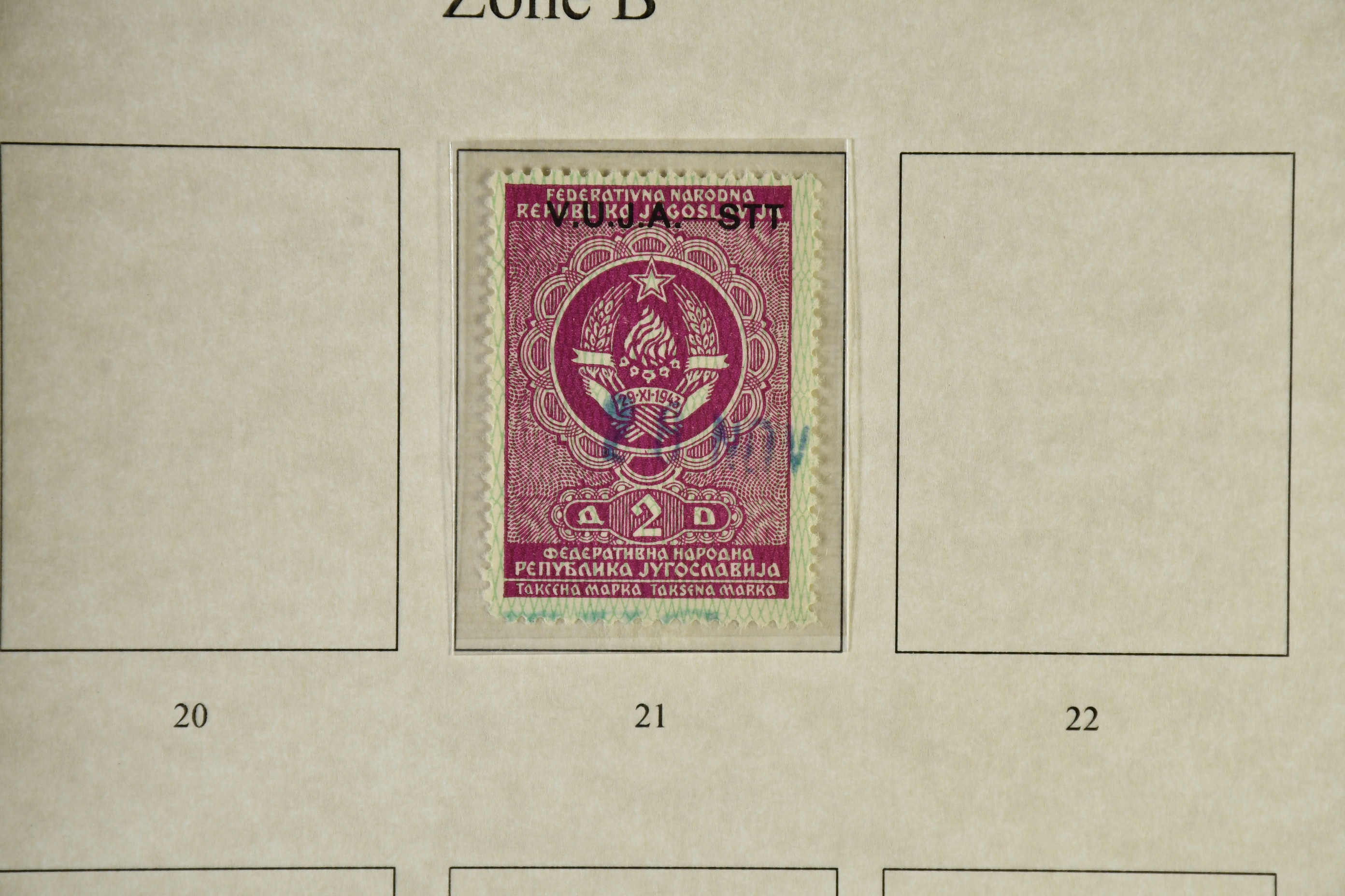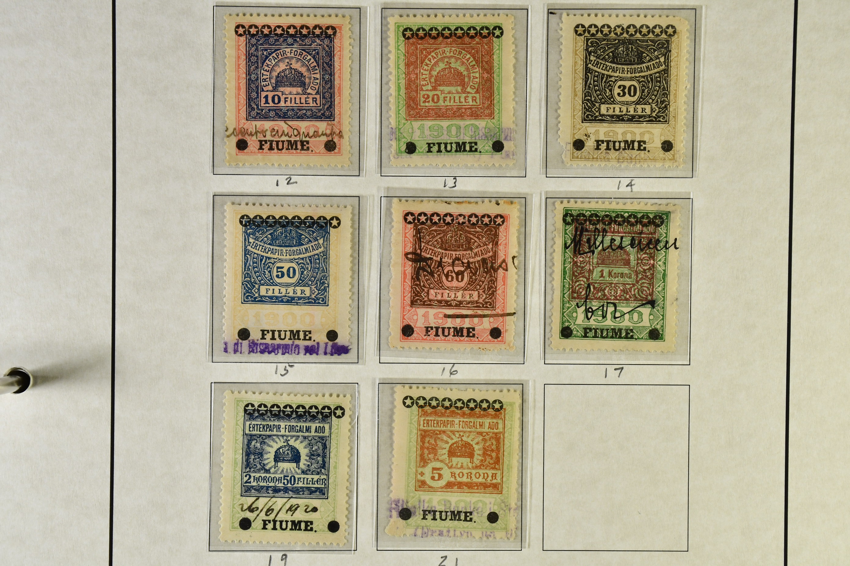Italy. ★★/★/⊙. Specifically Fiume and Trieste, one man's life time collection of back of the book. Several 100s of stamps, housed in one thick album very well presented, written up, all one of a kind with much identified by Barefoot. Beginning with Fiume from the Croatian Occupation through to the Italian printings, then the 'Marco da Bollo' o/ps to further Fiume o/ps with different stars and watermarks, overprint errors, as well as other unlisted. Virtually every issue seen for any purpose for Fiume such as stock transfers, passports, municipals, even Istria, Kupa-Sudsk onto WW2 types, very seldom seen. Similarly with the Partisan Government issues of Susak and equally scarce Kupa issues inc multiple pairs particularly for excise duty. Then the 'Diritti D'Urgenza' Venezia Guila, on to the free territory of Trieste with inter-panneau pairs through to AMGs, again very well represented, seemingly complete. Also noted Bills of Exchange, cigarette papers, stock transfers se-tenants, security papers in pristine condition, further se-tenants including large pictorials through to Romulus types and on to yet further errors and varieties, nearly all of it MNH, followed by 'weights and measures' with dramatic horizontally misplaced o/ps with the distinct probability of unique items present. So much here to research than this outline description. This collection is important, some material is quite exceptional. A most enjoyable viewing awaits the collector or dealer looking for the different and very scarce, offered intact as received.