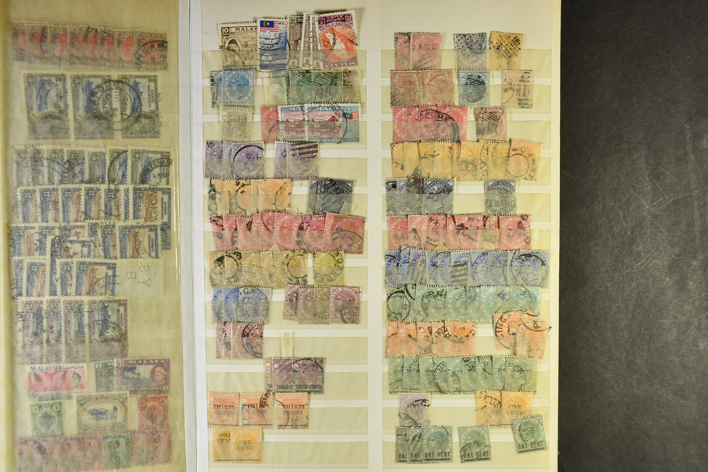 Malaysia. Mostly used. Thousands of stamps in large stockbook including some high values. Also states and Singapore. Please see a selection of scans at www.philea.se. Mostly good quality.
