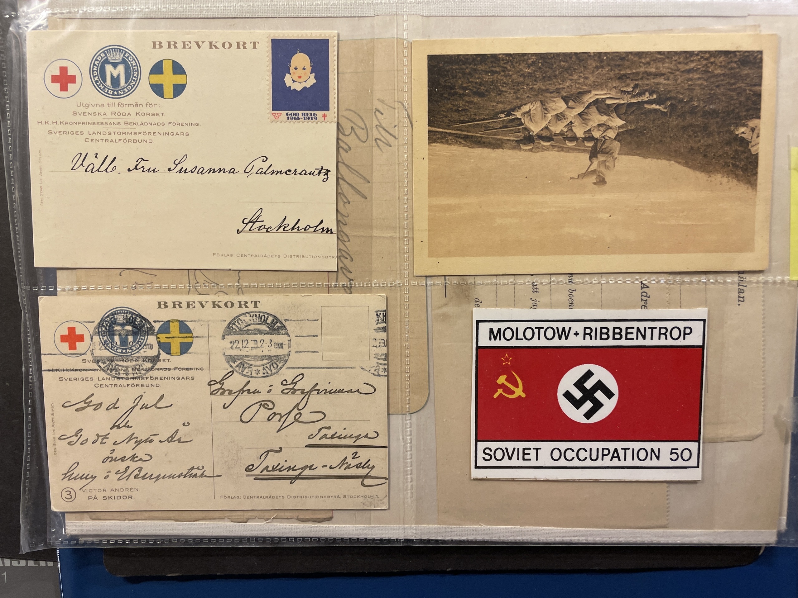 Sweden. Accumulation used 1924-1950 in album. remainder collection with stock 1924 issues, some SAAR batallion covers and lots of other milttary related items.