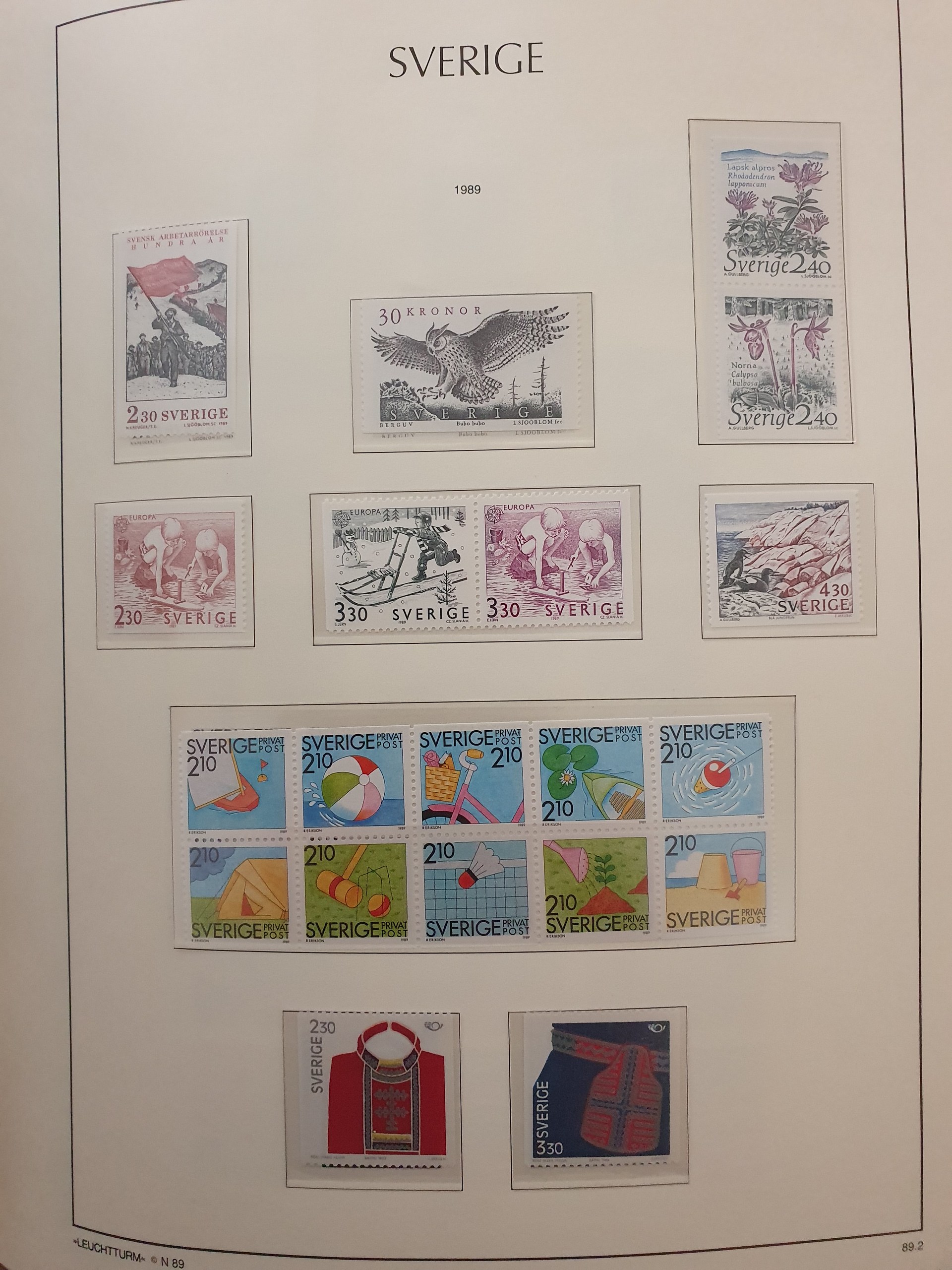 Sweden. Collection/accumulation mostly used 1951–1989 in box. In Leuchtturm album, plus two Visir albums contaning used stamps in blocks and booklets. Also two books, one contains about 4 skilling Norway and the other Nordisk Filateli's colour guide. Please see a selection of scans at www.philea.se. Good quality. Approx. 9 kg.