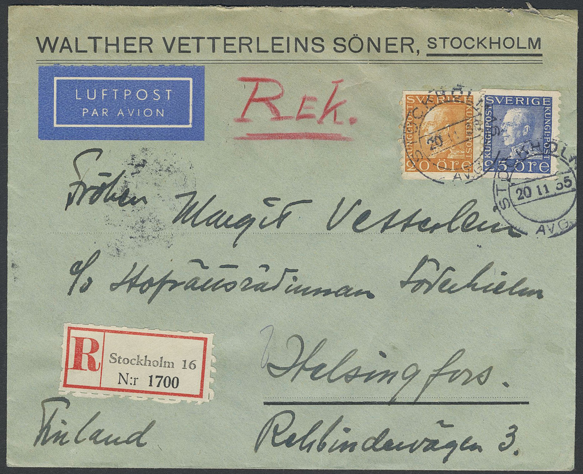 Sweden. Collection covers AIR MAIL 1935–1956 on visir leaves. Incl. registered and with special delivery, single stamp usages, censor, with paid poste restante fee, two covers with F366 (Facit: 1200 each), etc. Somewhat mixed quality. (12)