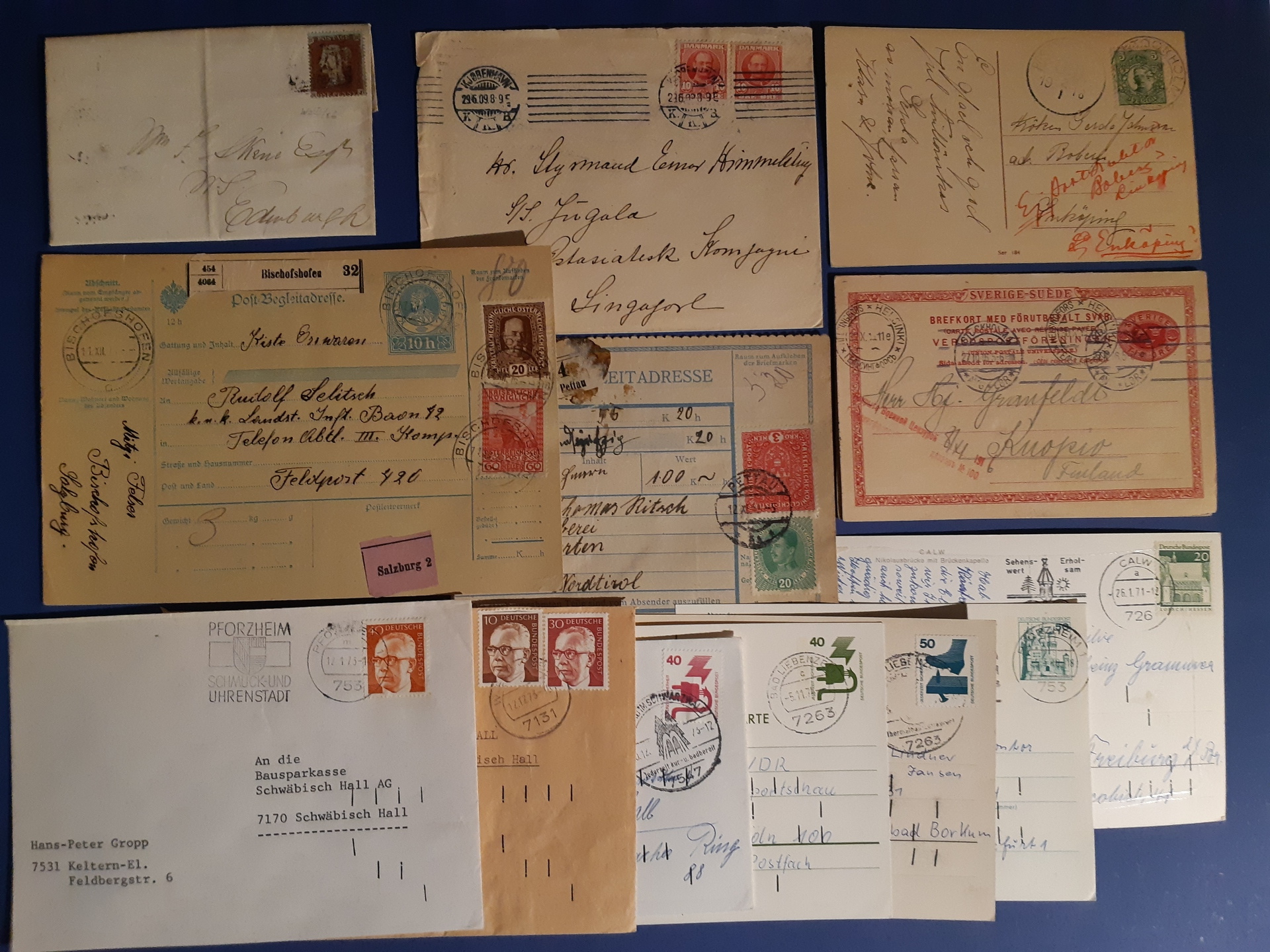 EUROPE. Lot covers. GB 1 p inland letter 1854, Denmark cover sent to Singapore 1909, Austria two address cards 1916–17, Sweden two postcards 1916–1918 and the rest BRD covers and cards 1969–1973. The entire lot is presented at www.philea.se. Mostly good quality. (20)