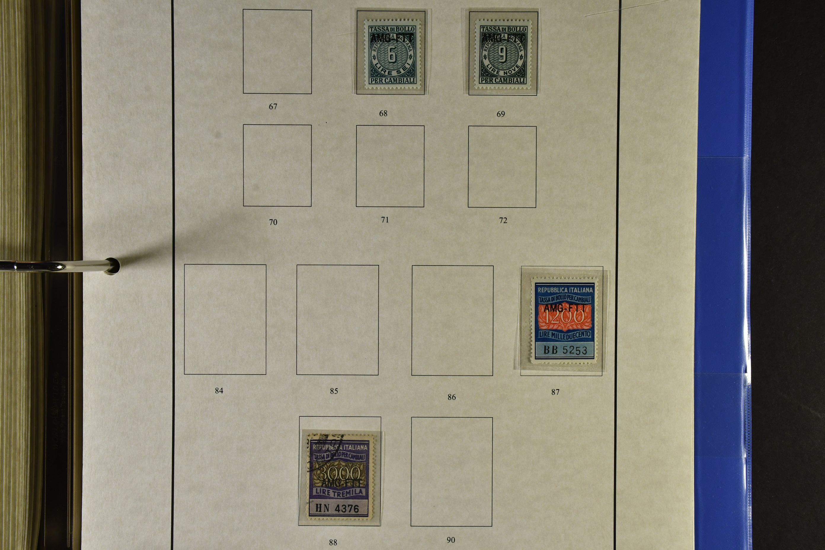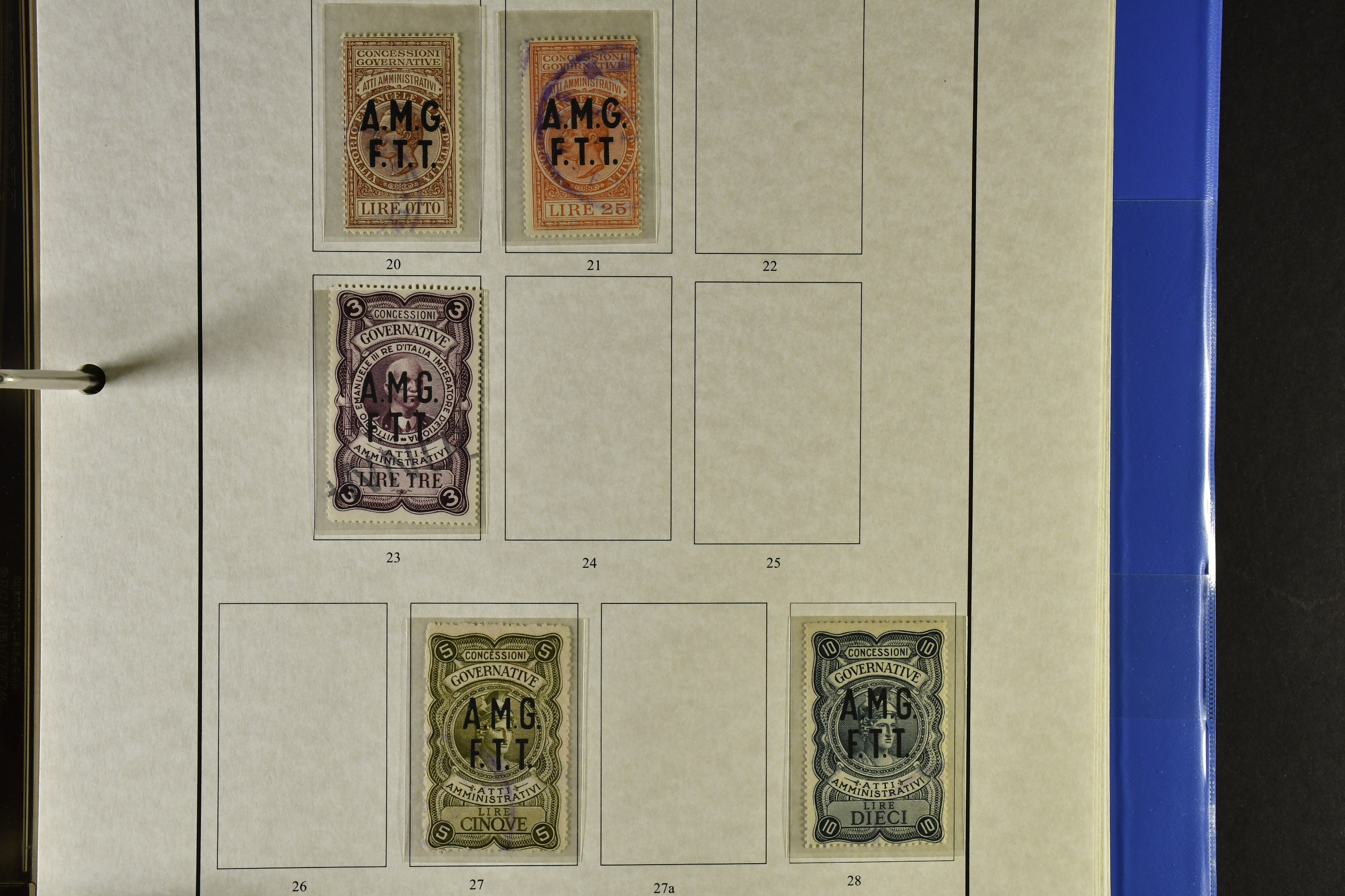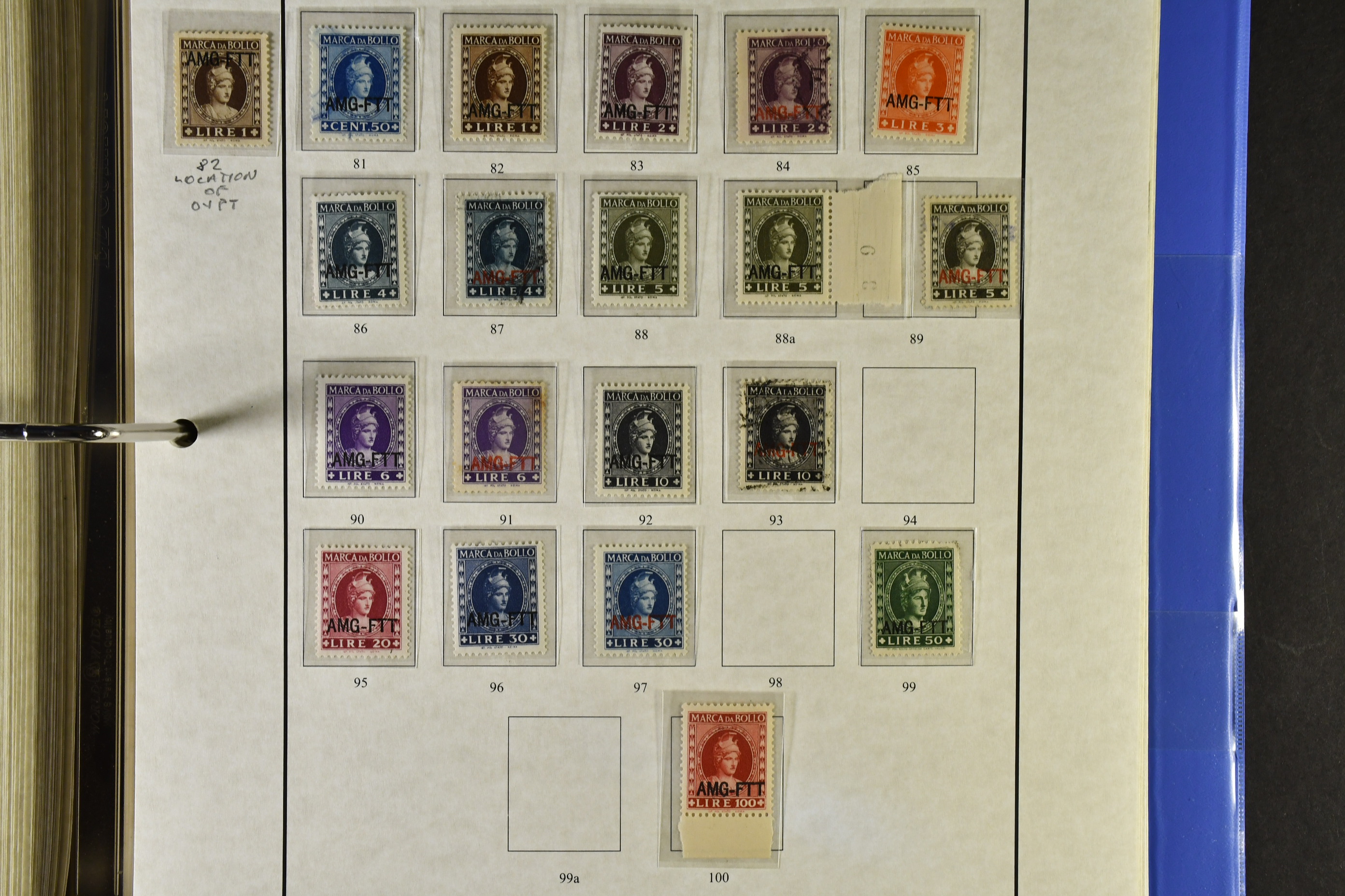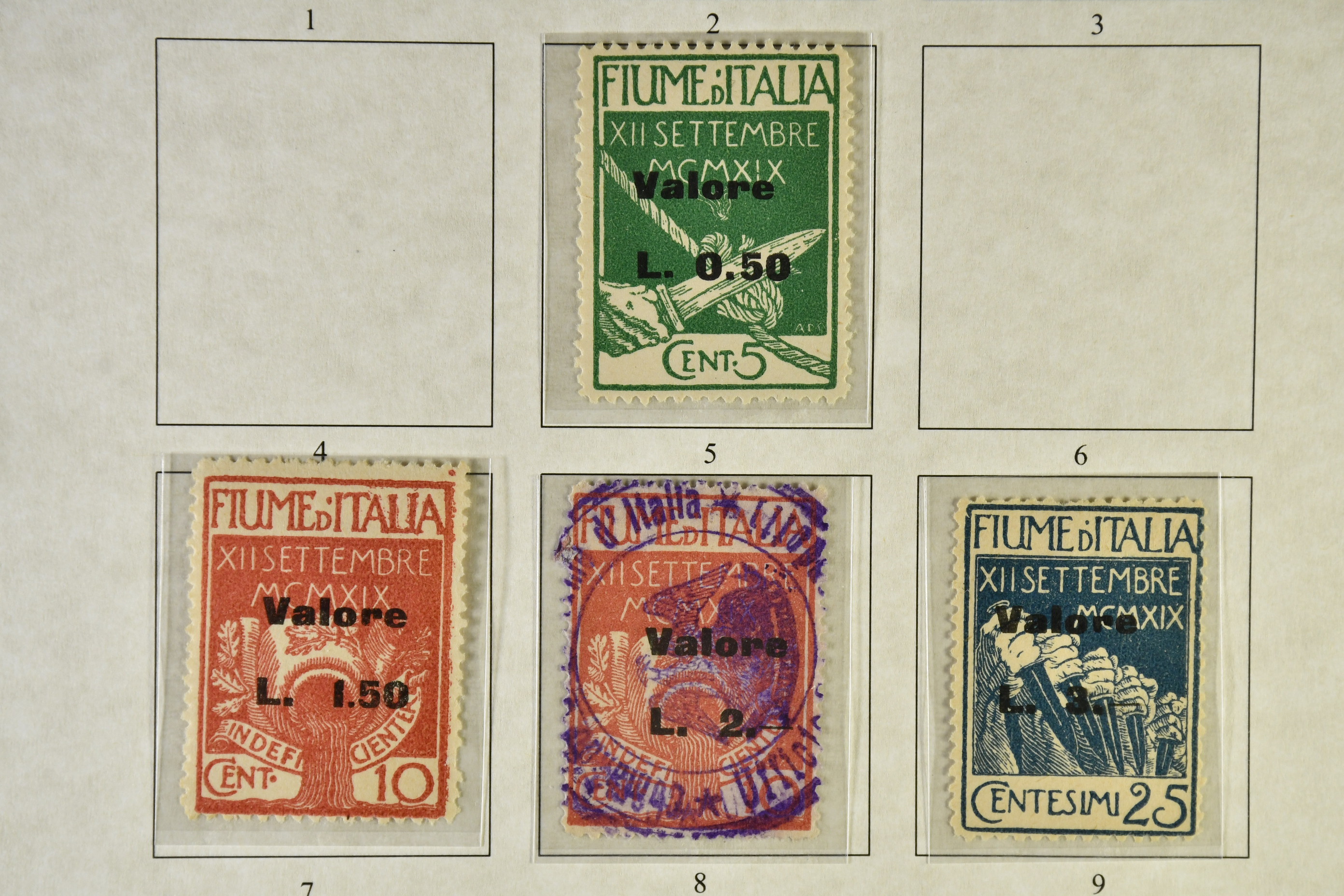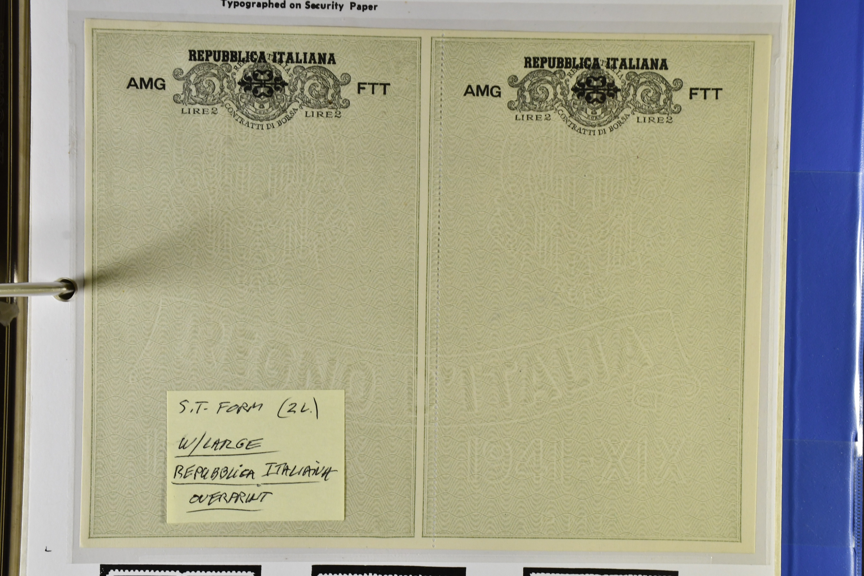 Italy. ★★/★/⊙. Specifically Fiume and Trieste, one man's life time collection of back of the book. Several 100s of stamps, housed in one thick album very well presented, written up, all one of a kind with much identified by Barefoot. Beginning with Fiume from the Croatian Occupation through to the Italian printings, then the 'Marco da Bollo' o/ps to further Fiume o/ps with different stars and watermarks, overprint errors, as well as other unlisted. Virtually every issue seen for any purpose for Fiume such as stock transfers, passports, municipals, even Istria, Kupa-Sudsk onto WW2 types, very seldom seen. Similarly with the Partisan Government issues of Susak and equally scarce Kupa issues inc multiple pairs particularly for excise duty. Then the 'Diritti D'Urgenza' Venezia Guila, on to the free territory of Trieste with inter-panneau pairs through to AMGs, again very well represented, seemingly complete. Also noted Bills of Exchange, cigarette papers, stock transfers se-tenants, security papers in pristine condition, further se-tenants including large pictorials through to Romulus types and on to yet further errors and varieties, nearly all of it MNH, followed by 'weights and measures' with dramatic horizontally misplaced o/ps with the distinct probability of unique items present. So much here to research than this outline description. This collection is important, some material is quite exceptional. A most enjoyable viewing awaits the collector or dealer looking for the different and very scarce, offered intact as received.