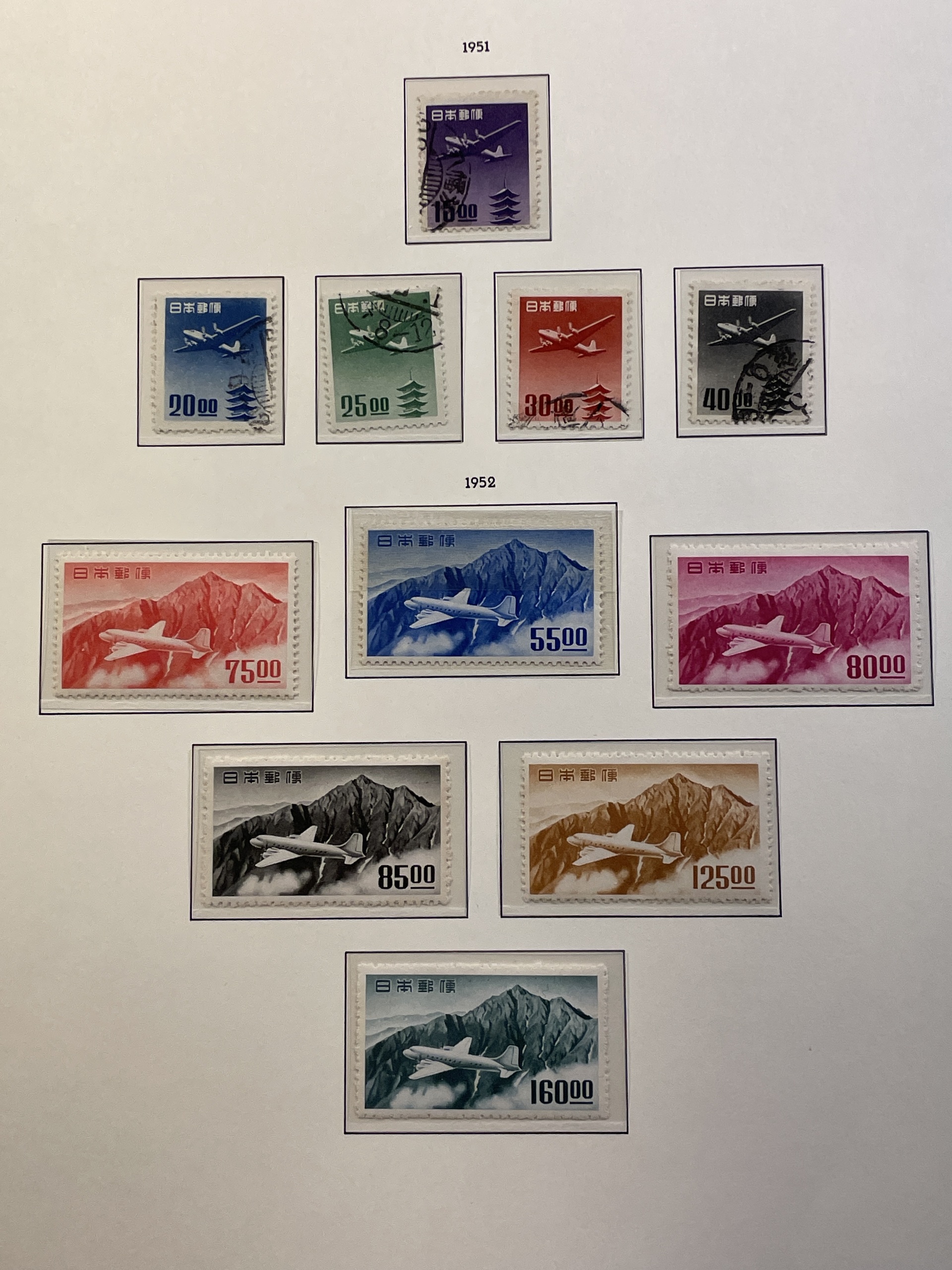 Japan. Lot ★★/★/⊙ 1919–1953 on leaves with stamp mounts. Air Mail stamps on Leuchtturm pages complete except M/S Mi 134–135 mint (3s faded color), 195–198, 204 Used, 494–498** Pheasant, 550–554 Used, 566–571 light gum toning and the usual gum bends. 597–600 Mixed used and mint with 597**, 576–581 Used set and extra 581** and 615–618** and used. The entire lot is presented at www.philea.se. The entire lot is presented at www.philea.se. Mostly fine quality. (39)