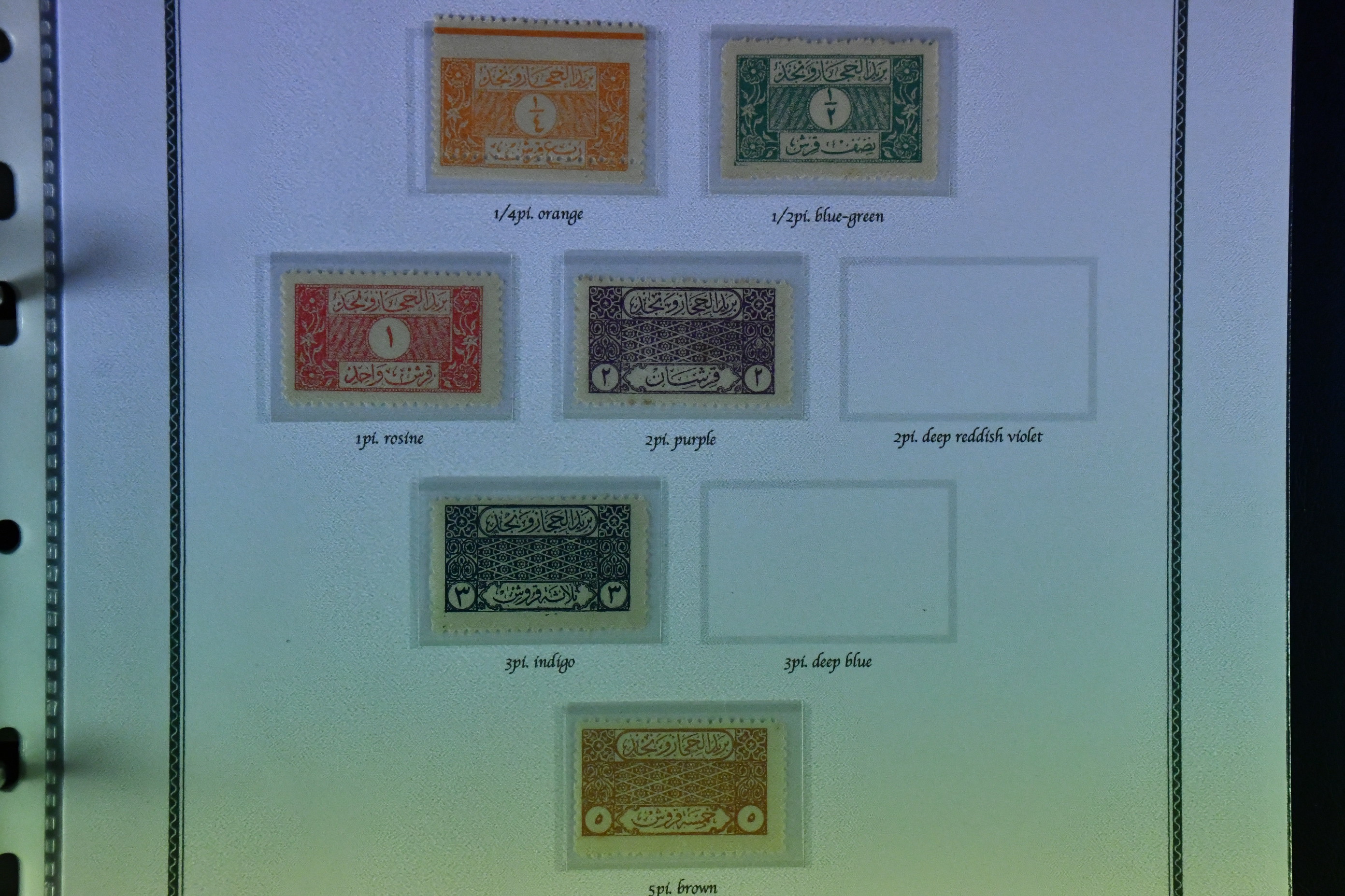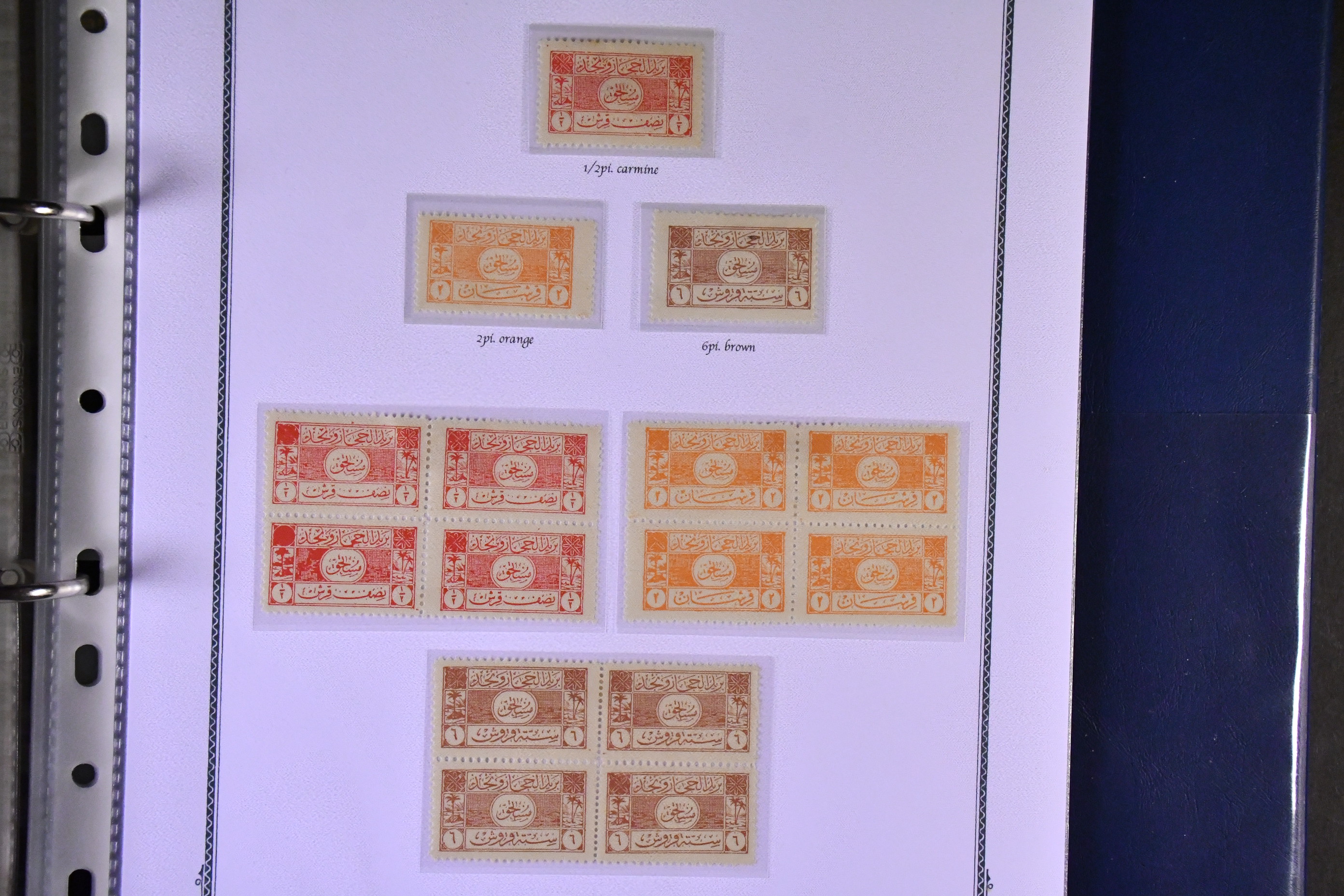 Saudi Arabia. Collection ★ 1916–1934 in album. Remarkable collection from the first Hejaz issues, unframed Hashimite o/ps, zig zags through to the framed issues incl. errors, similarly 1922 types, ending with the postage dues incl. inv. o/p, etc. This sections ends with 1922/1923 with handstamp o/ps and not forgetting the gold o/ps of 1924, again extensive and interesting. Then follows the Jeddah 2 line o/ps, further zig zags on to further postage dues and the 3 line red o/p types, incl. inverted as well as normal, the black o/ps, also present to high values. Similarly so with the blue ops to 10Pi and yet again the 3rd prov and the rectangular control issues with dozens here, looking very impressive. The next section just as good with Nejd, namely the occupation stamps of Hejaz, not just the regular defin o/ps but also the fiscals ad bill stamps, the good railway tax stamps, etc. Finally Ottoman overprint issues Mustahiq black and commemorative handstamp railway issues to 1000PI o/ps, on to 1926 blocks of 4, pans-Islamic conference 1927 types and the Annexation issue again complete on to British Mandate Terriorty, etc, etc. A wonderful collection, much more than this outline description, with many hardly ever seen issues and much unlisted that will delight the specialist. Please refer scans, you will not be disappointed. Fine quality.