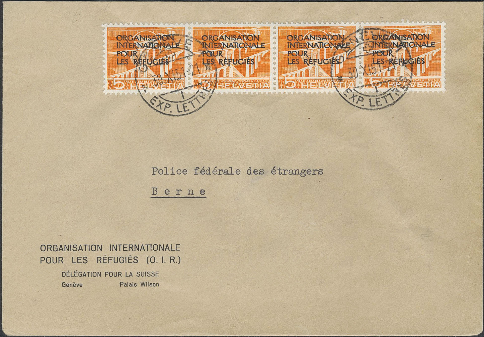 Switzerland, OIR/IRO. Michel 1 on cover, 4×5 (c) in strip of four on cover sent from GENEVE 1 30.XI.57 to Berne.