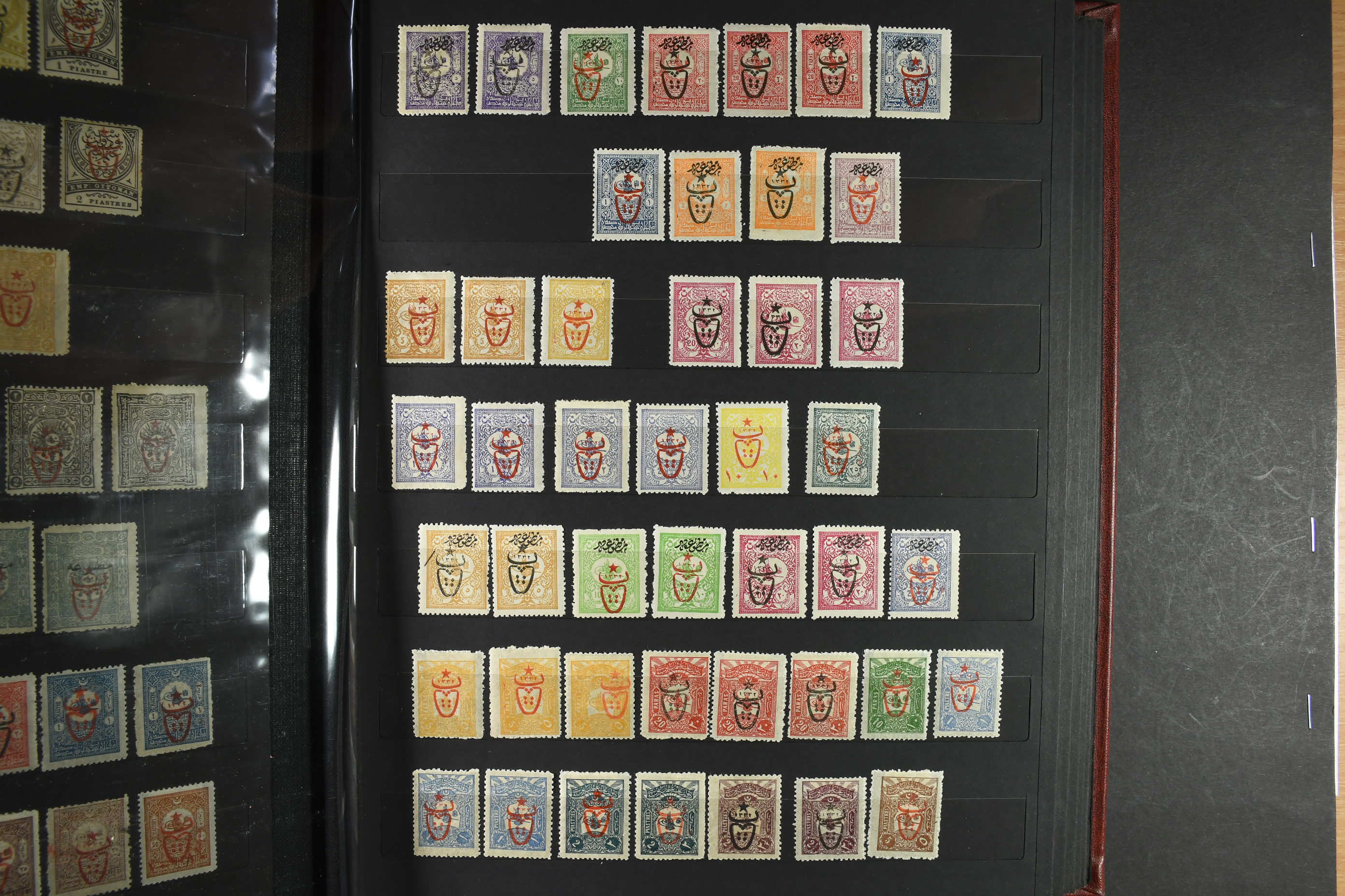Turkey. ★★/★/⊙. Comprehensive and specialized collection 1913–21 in two albums with several expensive stamps, proofs, error prints, and varieties etc. E.g. an extensive part Overprints 1917, some Sinai 1918, and an interesting part Republic (some forgeries may appear). Please see a selection of scans at www.philea.se. (900-1000)