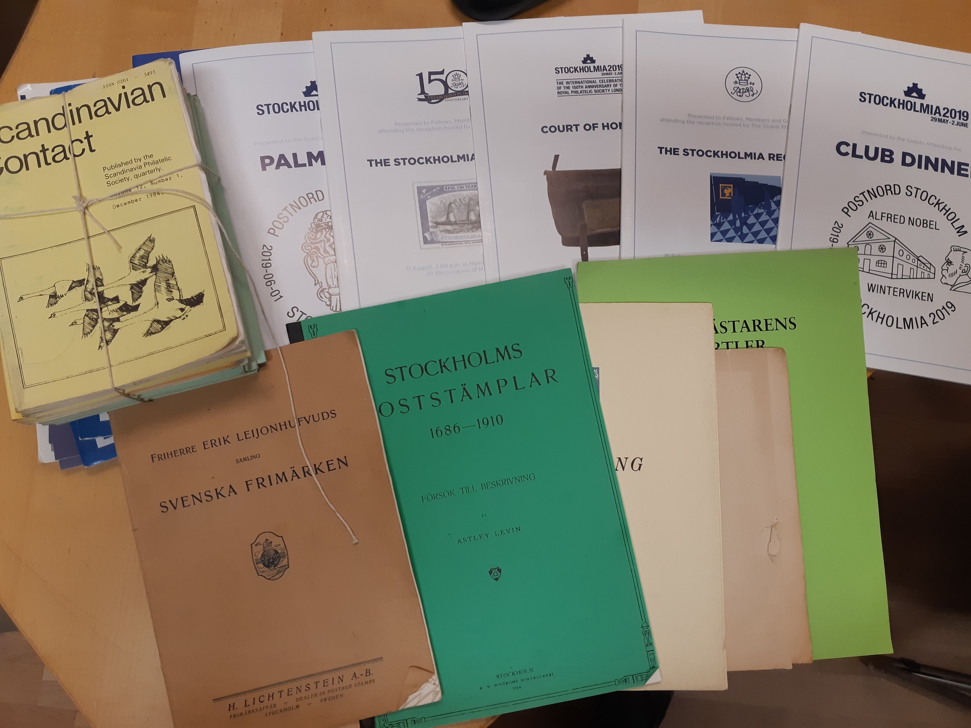 Literature. Journal: Scandinavian Contact, hardbound 1956–62, 65–68 and 71–77, plus fifty loose Nos. 1979–1992. Exhibition catalogues: STOCKHOLMIA 2019. Set of publications, incl. both bulletins, four different handouts, exhibition program, palmarès and the three different special issues of London Philatelist. Further books about postal history and picture postcards as well as several auction catalogues, mostly Feldman and Köhler. The entire lot is presented at www.philea.se. Must be picked up. (200+). Approx. 37 kg.