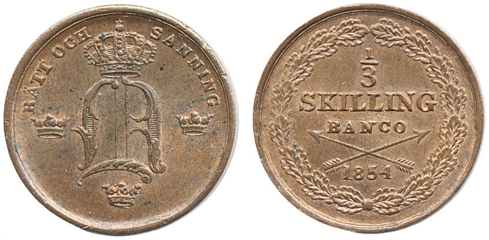 Coins, Sweden. Oskar I, SM 110, 1/3 skilling banco 1844. Red lustre. 01/0.