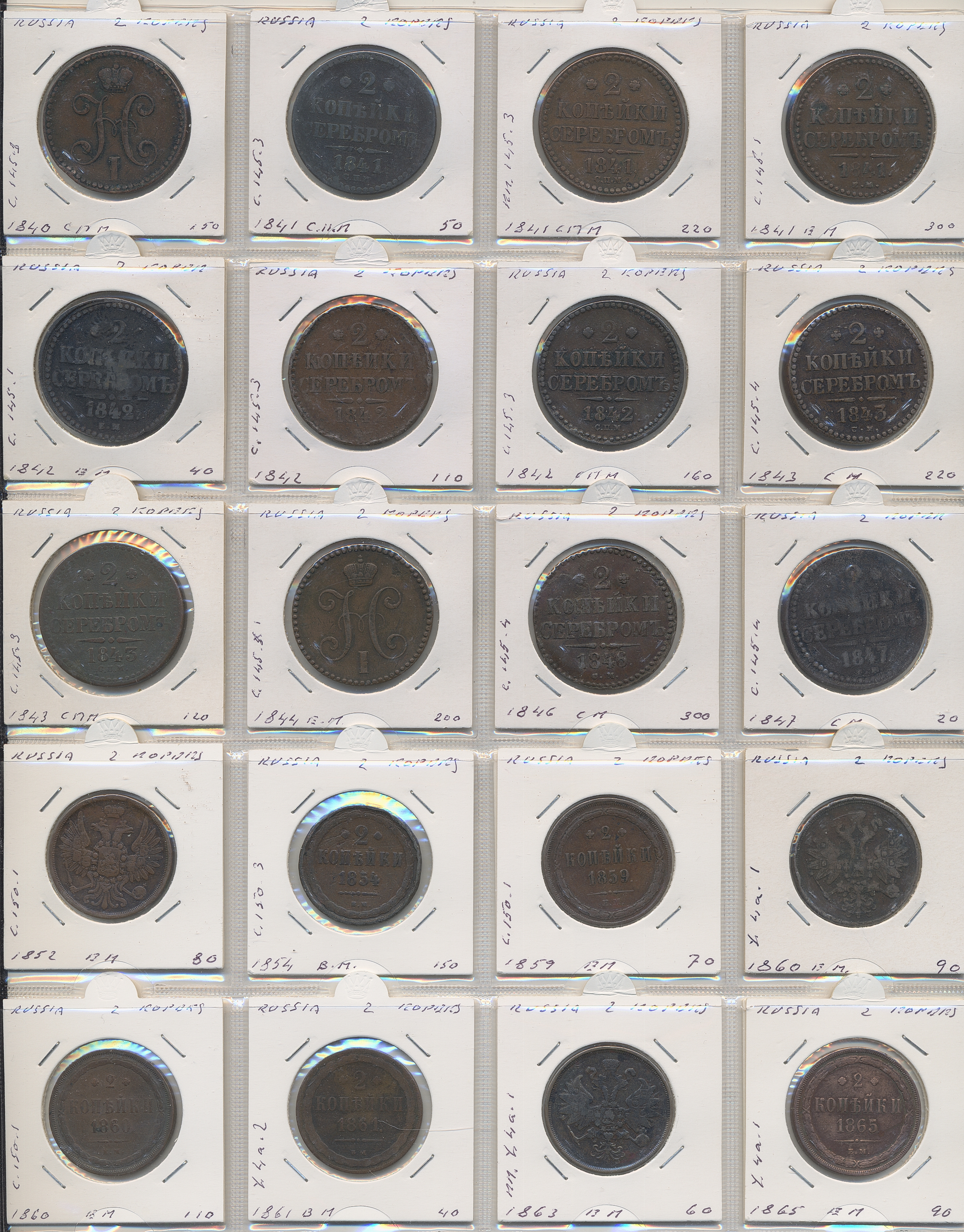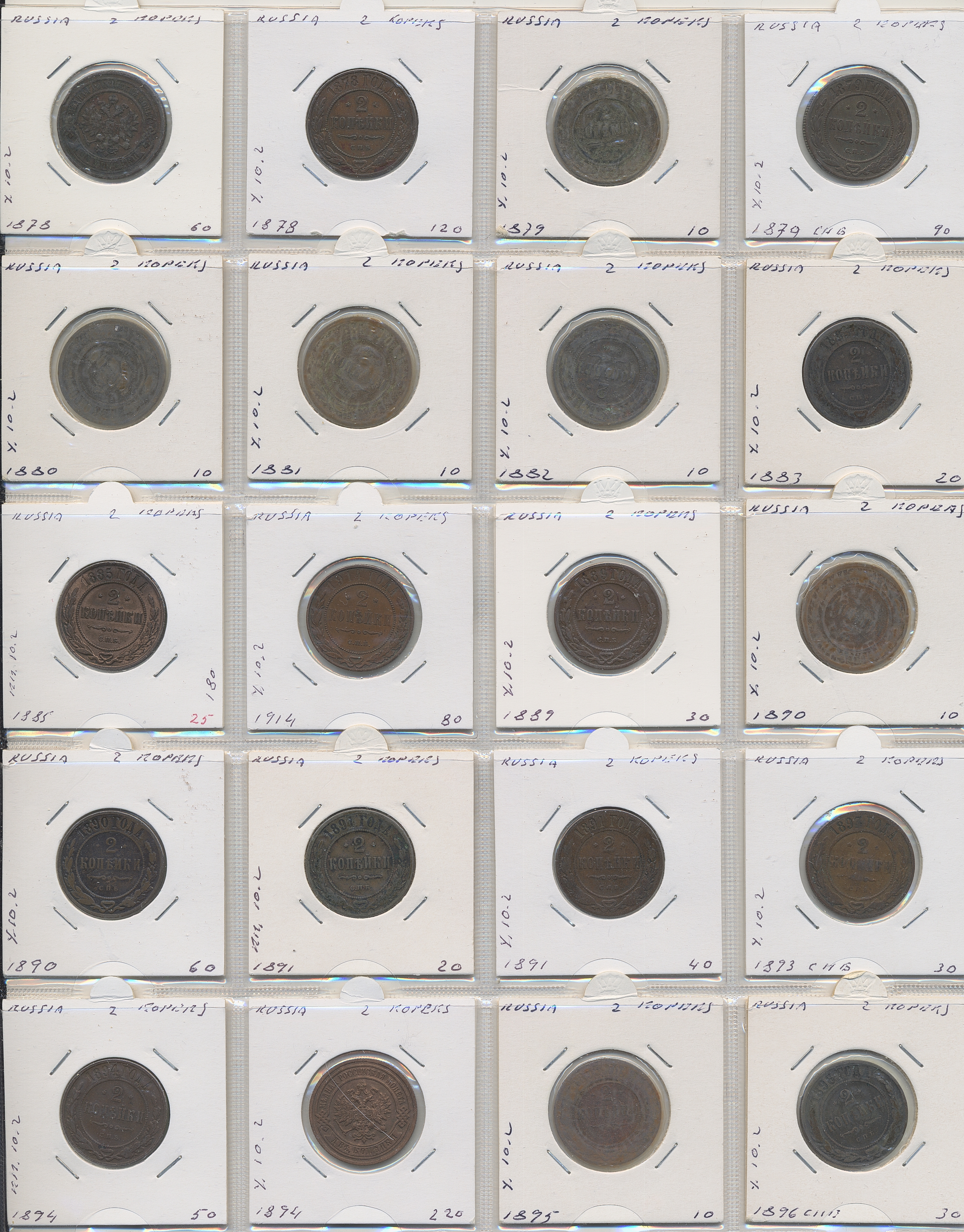 Coins, Russia. Collection of Russian copper coins 1700s–1917 in album with almost all different coins from 2 kopeks to 10 kopeks. In total 269 coins. Please inspect carefully! VG-XF/UNC.
