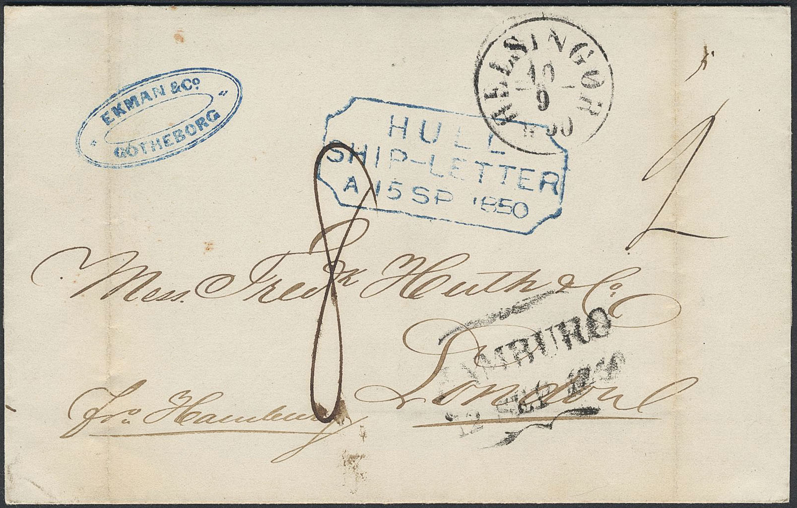 Sweden. Foreign-related cover. Great Britain. Partly prepaid letter sent from GÖTHEBORG 8.9.1850 via Hamburg as ship letter to Hull and then to London. Cancellations HELSINGØR 10.9.1850, HAMBURG 12.SEP.1850, HULL SHIP-LETTER A 15.SP.1850 and AC 16.SP.1850. Postage due notation "8" (d).