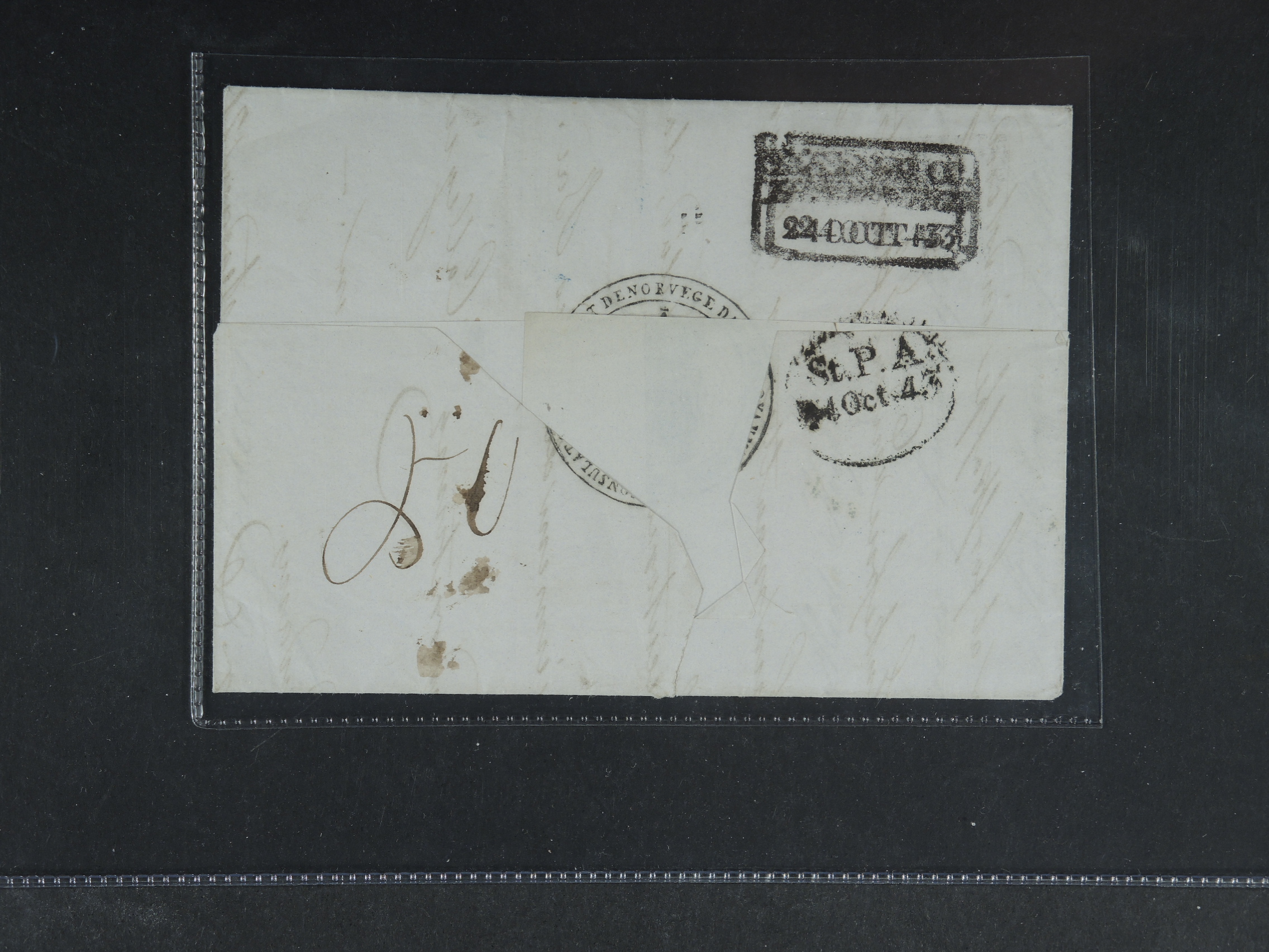 Sweden. Foreign-related cover. Netherlands. Incoming letter dated "Amsterdam 21 Octbr 1843" sent to Stockholm. Cancellations AMSTERDAM 21.10, FRANCO HAMBURG, ST.P.A. 24.OCT.43, and KS&NPC HAMBURG 24.OCT.43.