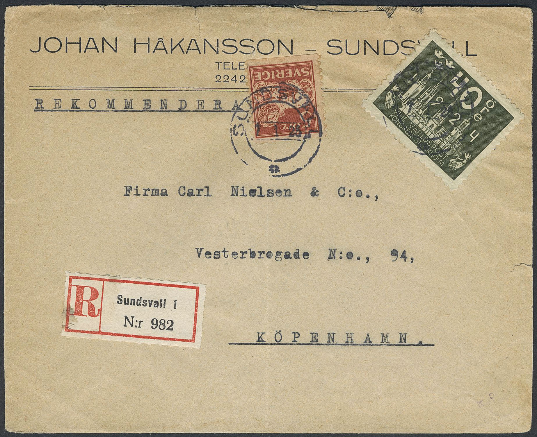 Sweden. Facit 203, 142A on cover, 5+40 öre on registered cover sent from SUNDSVALL 7.1.25 to Denmark. Arrival pmk KØBENHAVN 2.OMB 9.1.25. Weak fold through the 5 öre stamp, and one missing perf on the 40 öre stamp, but still an attractive usage abroad.