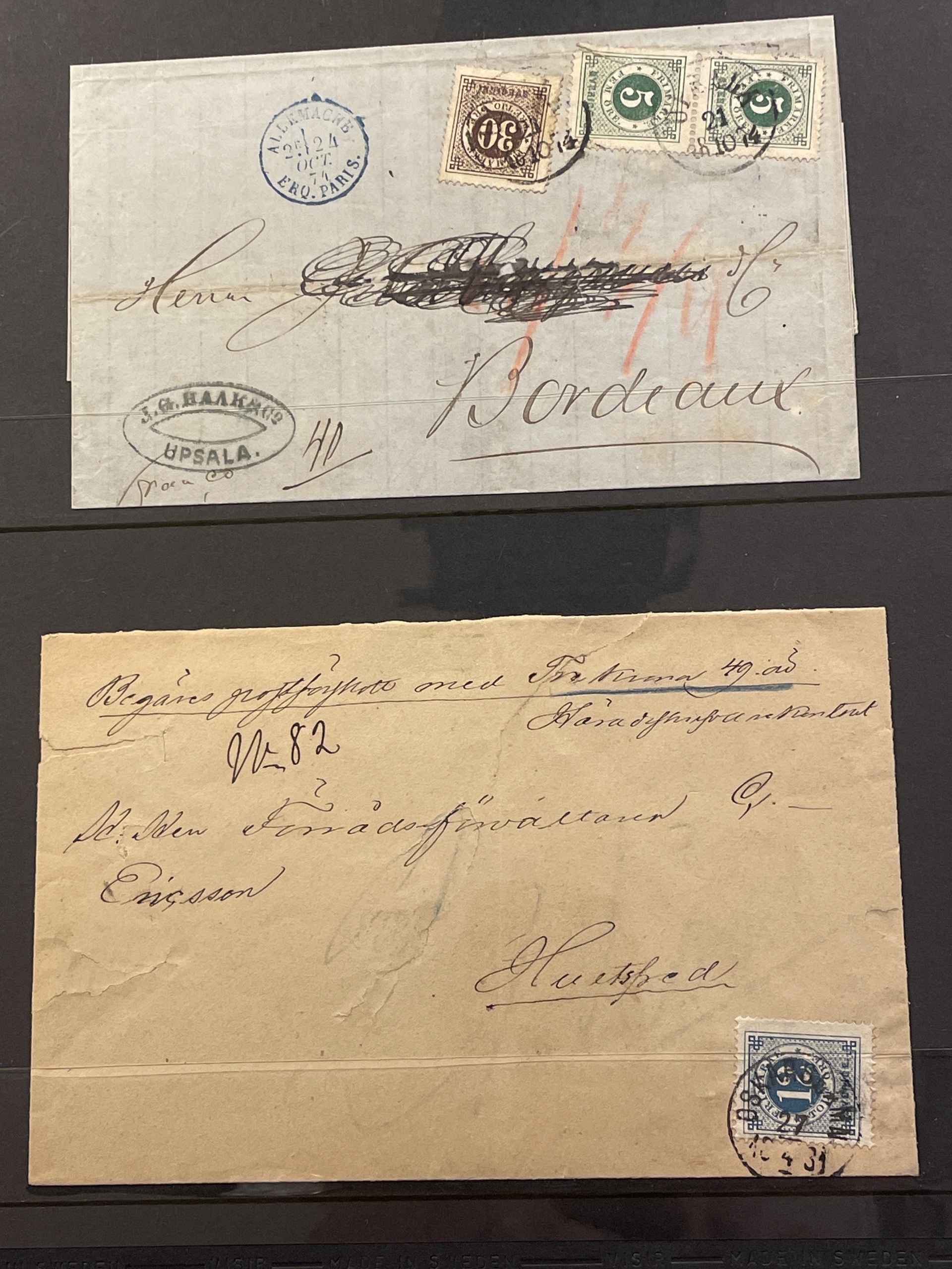 Sweden. Lot covers SELECTED BETTER ITEMS. 2×F19+25 on pre-GPU cover sent via Germany to France (two recorded), F32 on cash on delivery cover 1881, F154–155 on address card and special delivery cover, respectively, and two over-weight covers sent to Switzerland with e.g. F208 and 209. The entire lot is presented at www.philea.se. Somewhat mixed quality. Facit 66000 (6)