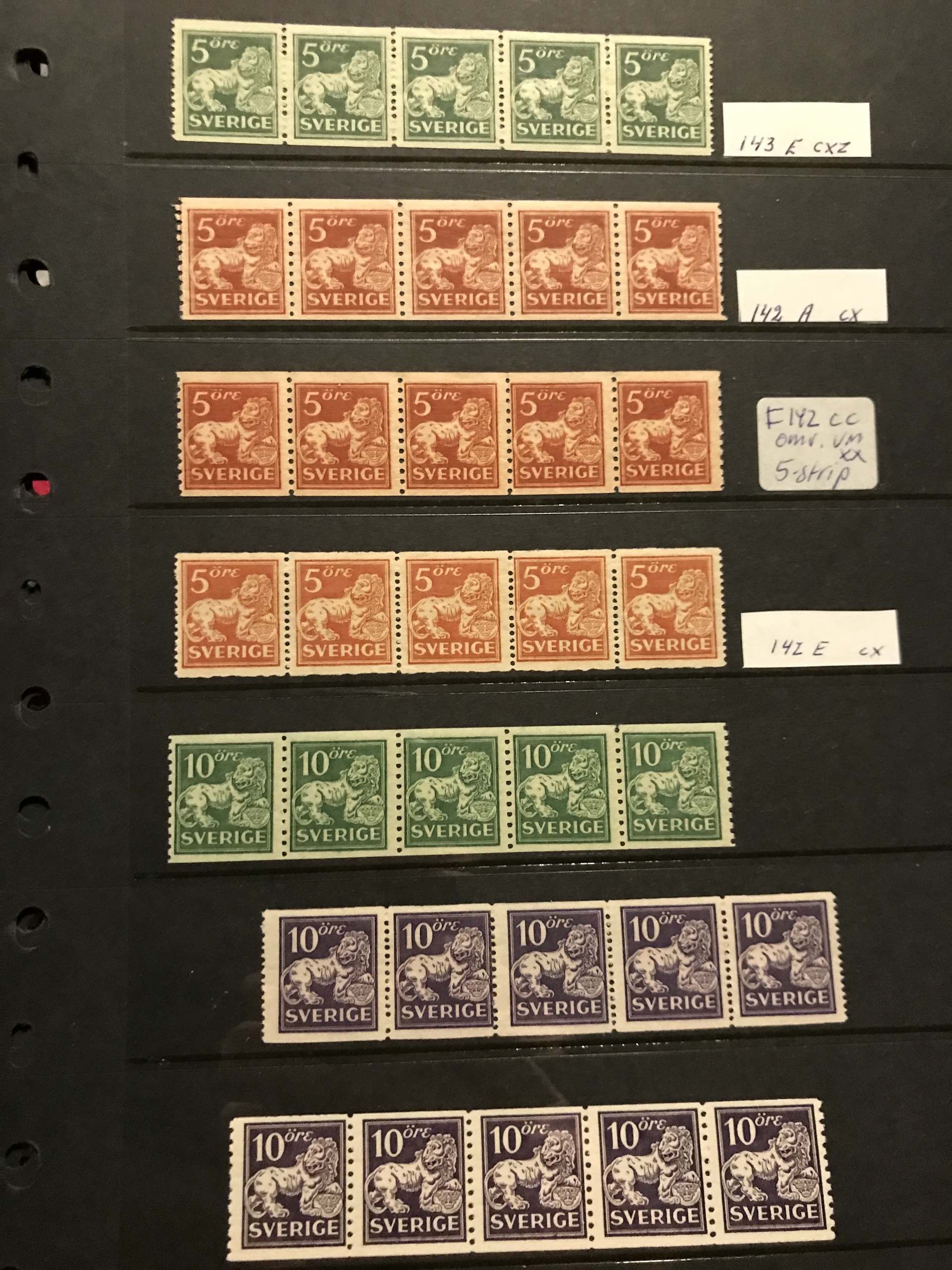 Sweden. ★★. COIL STAMPS. 34 different strips-of five F140–195. Containing e.g. F140A, 142Acc, 147, 148C, 180, 183a, 187c, 191a and 193–95, etc. F >42000. The entire lot is presented at www.philea.se.