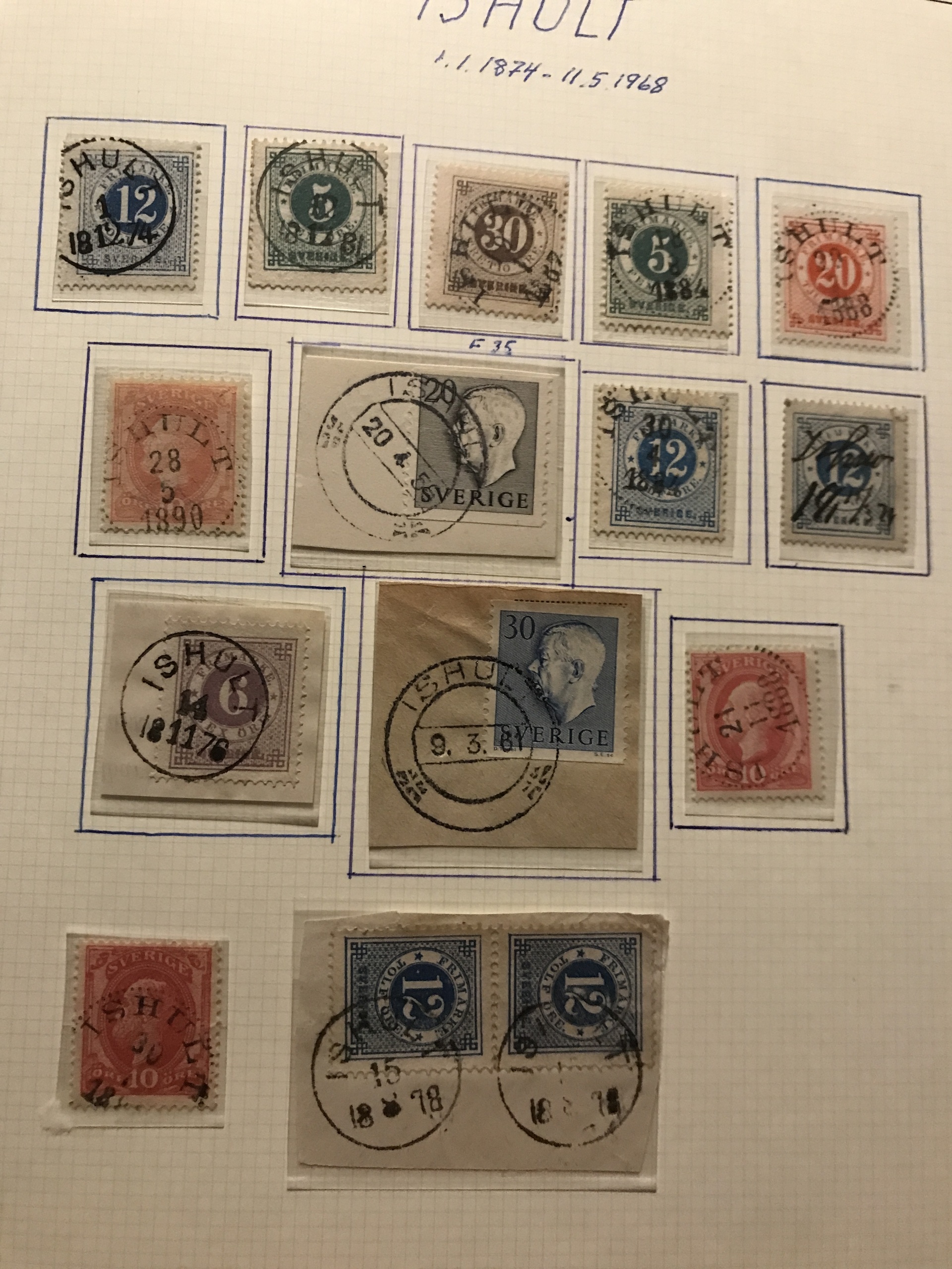 Sweden. Cancellations. VIMMERBY Municipality. Binder with about 530 cancellations Coat-of Arms–modern. Containing e.g. Hällerum, Lindstorp and Tofverum on Oscar, Lindstorp and Wäderum Circle types, Spångenäs GV Medallion, nice old postcards incl. Vimmerby railway 1906, etc. Please see a selection of scans at www.philea.se.
