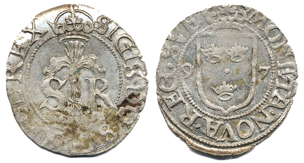 Coins, Sweden. Sigismund, SM 23a, ½ öre 1597. 1.45 g. Stockholm. Planchet flaw, partly weakly struck. SMB 30. 01.