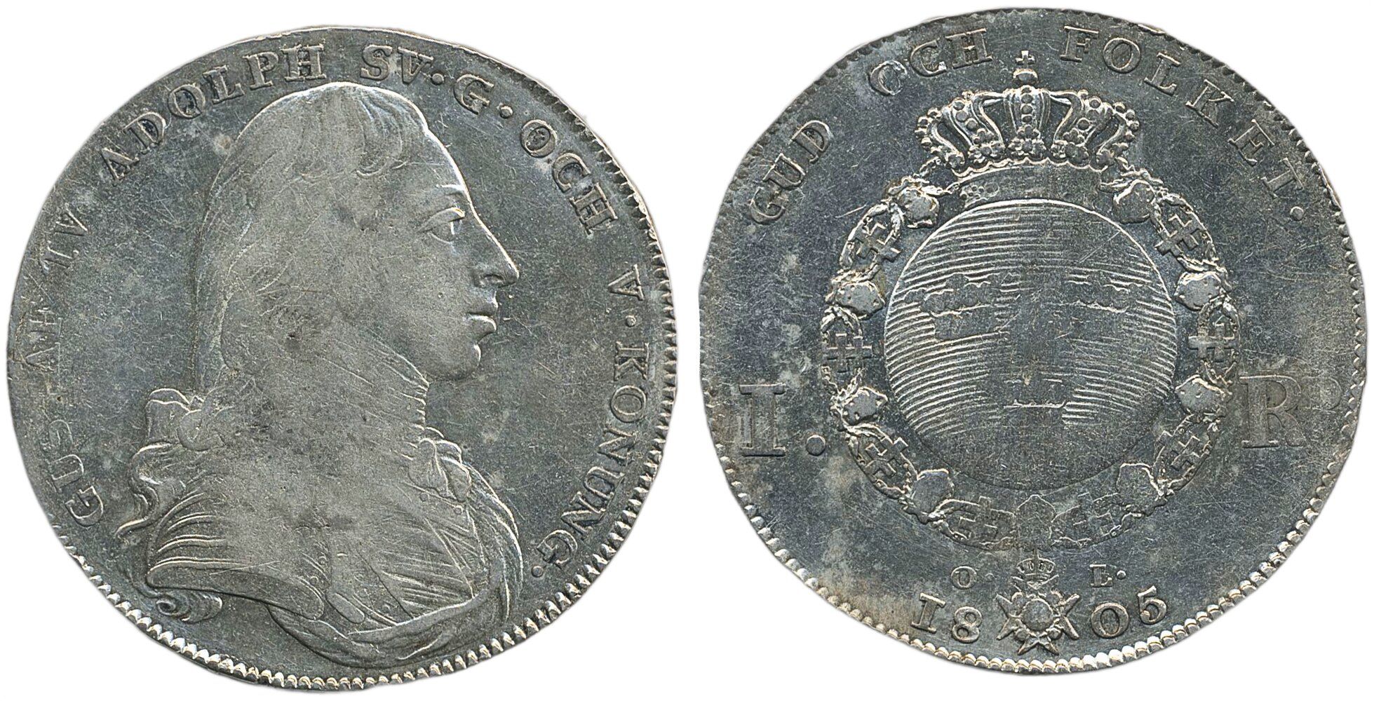 Coins, Sweden. Gustav IV Adolf, SM 28, 1 riksdaler 1805. 29.10 g. Stockholm. Weakly struck, adjustment marks. Lightly cleaned. 1+.
