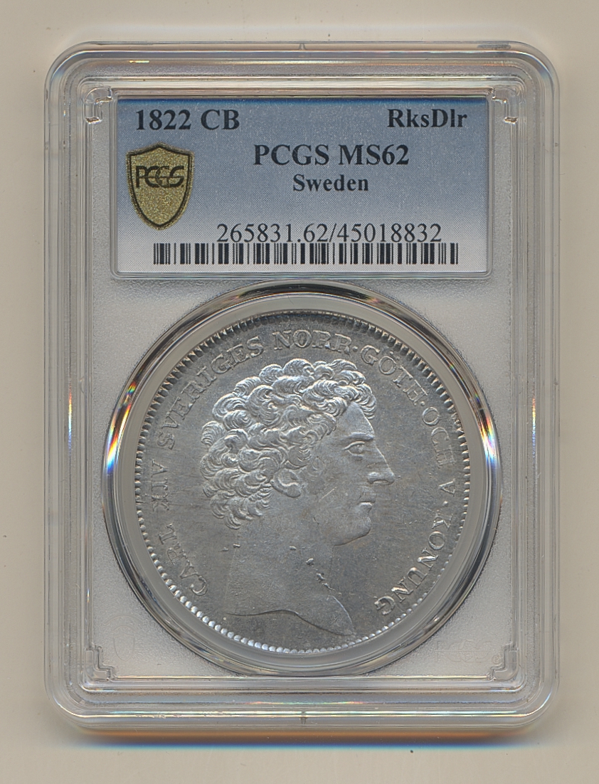 Coins, Sweden. Karl XIV Johan, SM 44, 1 riksdaler 1822. Stockholm. Minor adjustment marks. Beautiful lustrous example. Graded by PCGS as MS62. g01. See certification at PCGS