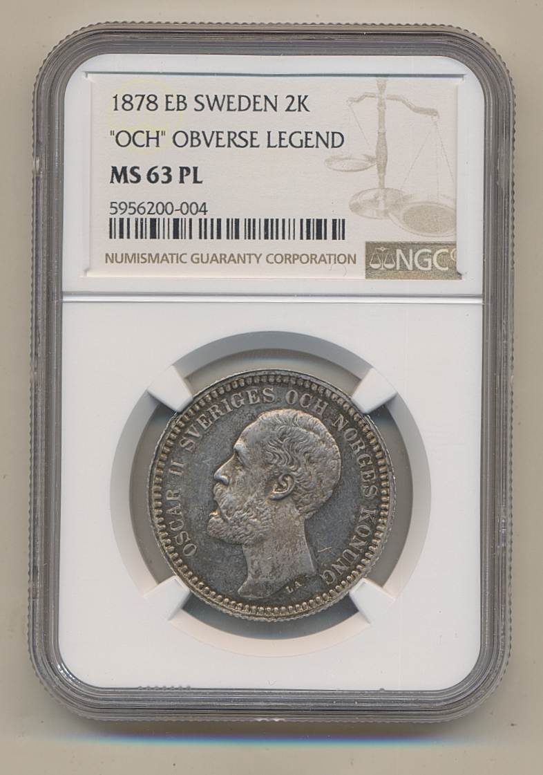 Coins, Sweden. Oskar II, MIS II.1, 2 kronor 1878. With OCH in legend. Very scarce in high grade. Graded by NGC as MS63 PL. The coin has reflective proof surfaces and should in our opinion have been graded as proof. The obverse shows faint scratches in the left field while the reverse is magnificent looking. The coin has a distinct raised rim typical of presentation pieces. 01/0. See certification at NGC