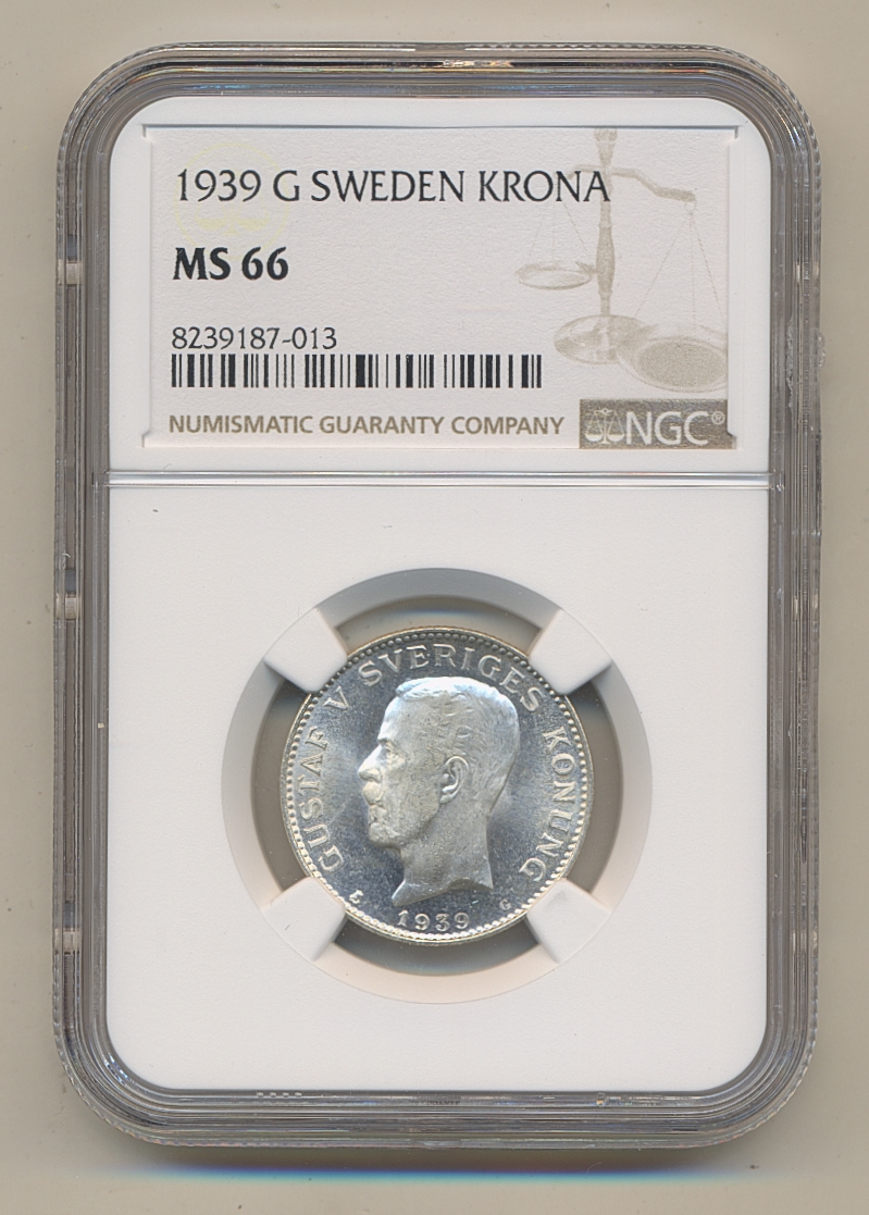 Coins, Sweden. Gustav V, MIS I.25e, 1 krona 1939. Graded by NGC as MS66. 0.