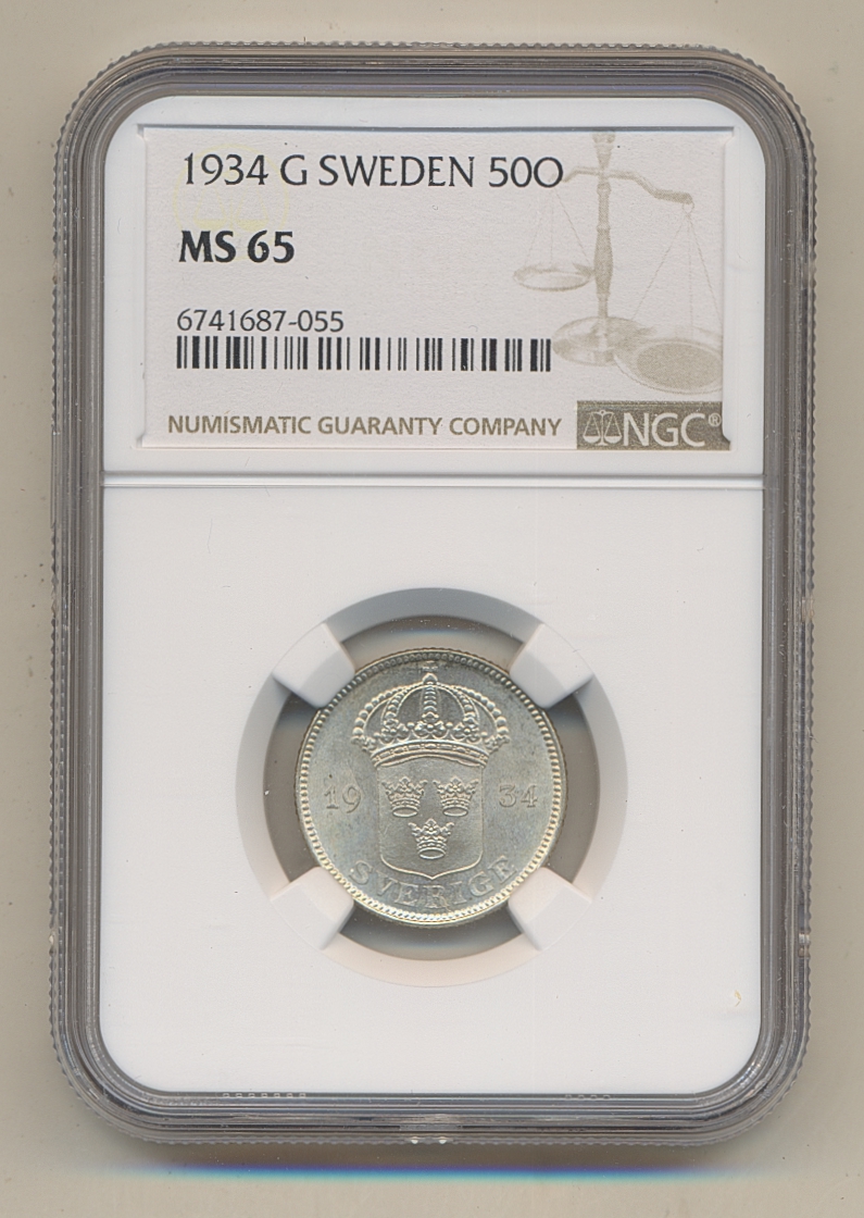 Coins, Sweden. Gustav V, MIS I.12, 50 öre 1934. Graded by NGC as MS65. 01/0. See certification at NGC