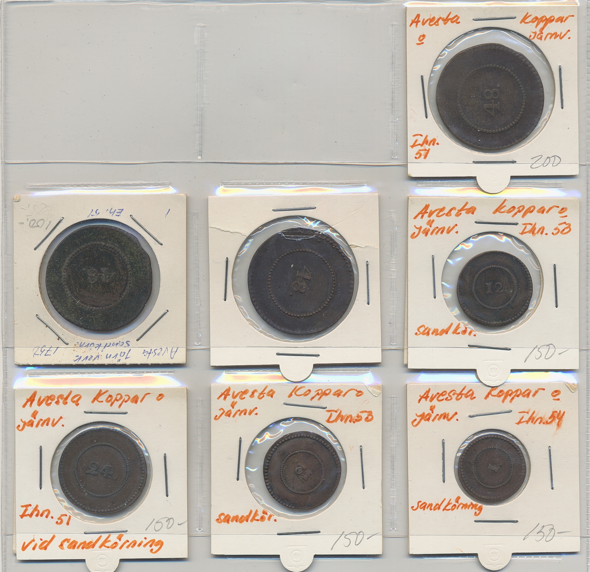Tokens, Sweden. Seven tokens, Avesta koppar o järnverk, sandkörning 1–48, mixed quality. .