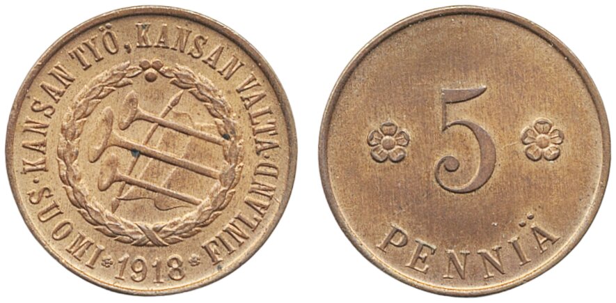 Coins, Finland. Republic, KM 21, 5 penniä 1918. Knot at centre. Lustrous example with hints of red. 01.