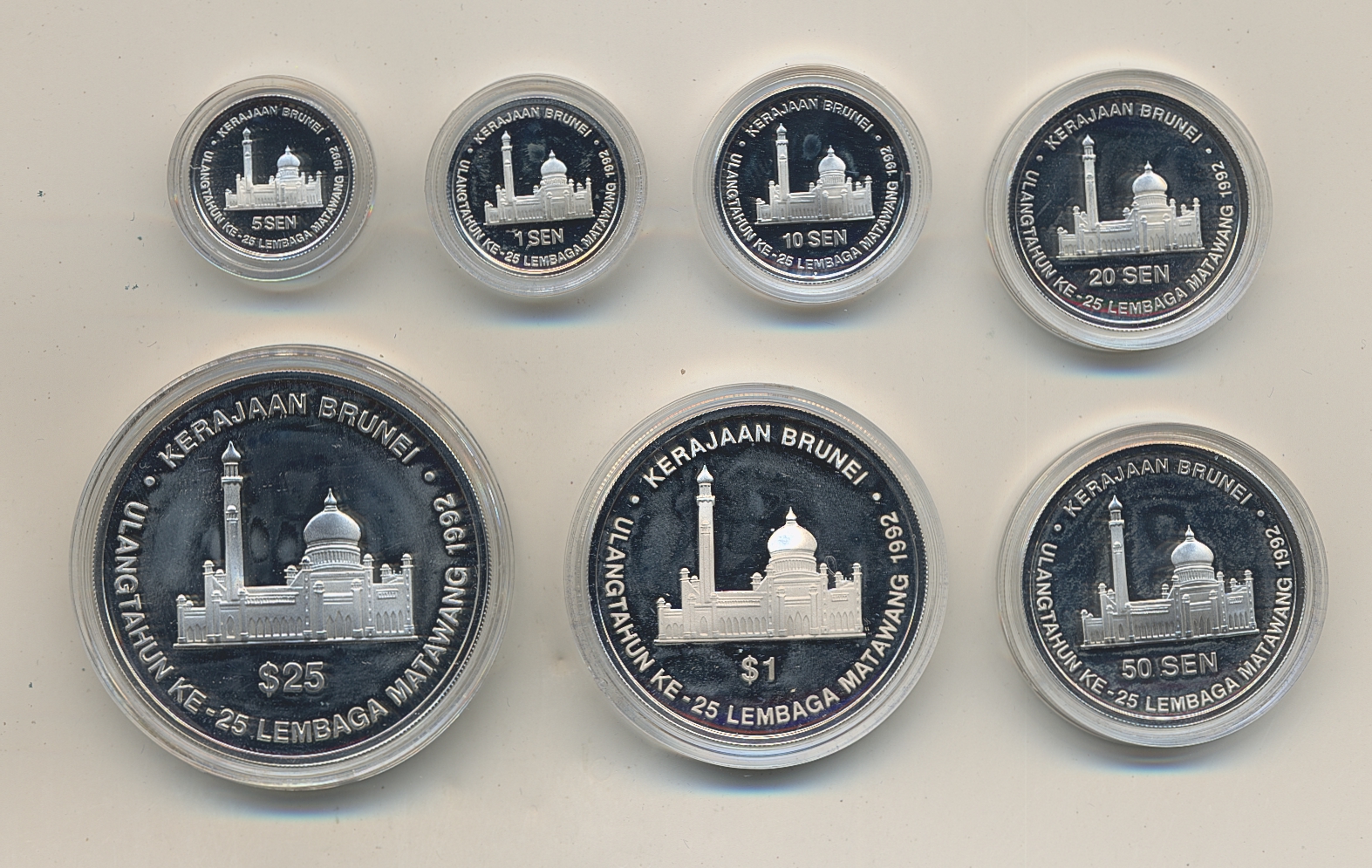 Coins, Brunei. KM 50 etc., 25TH ANNIVERSARY OF BRUNEI CURRENCY BOARD 1992. Silver proof set in an elegant box. Low mintage! + Oman. Omani rial 1996 KM 101. Proof.