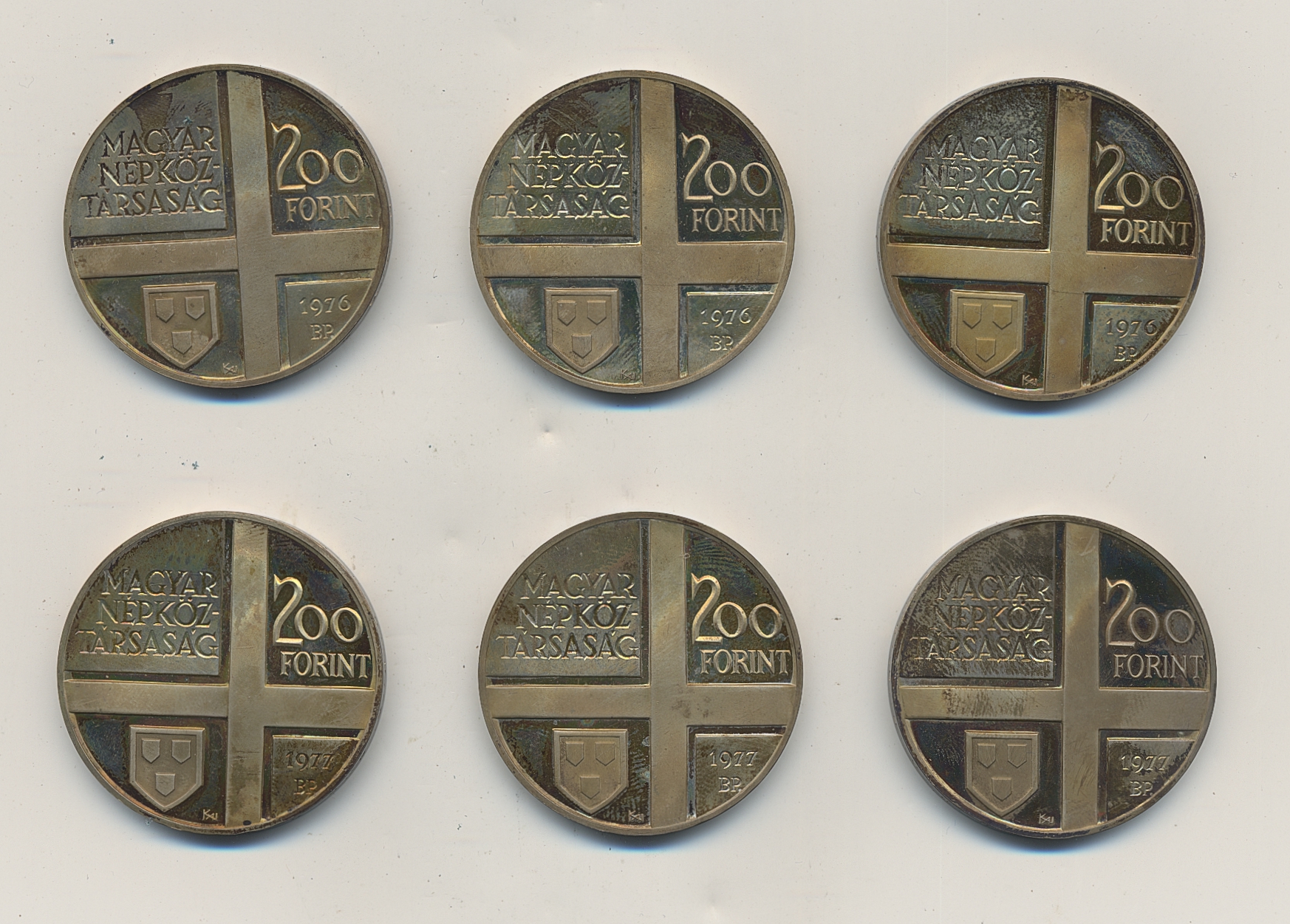 Coins, Hungary. KM 607, 608, 609, 610, 611, 612, 200 forint. Six different commemorative coins in silver 1976–1977. The entire lot is presented at www.philea.se. UNC.