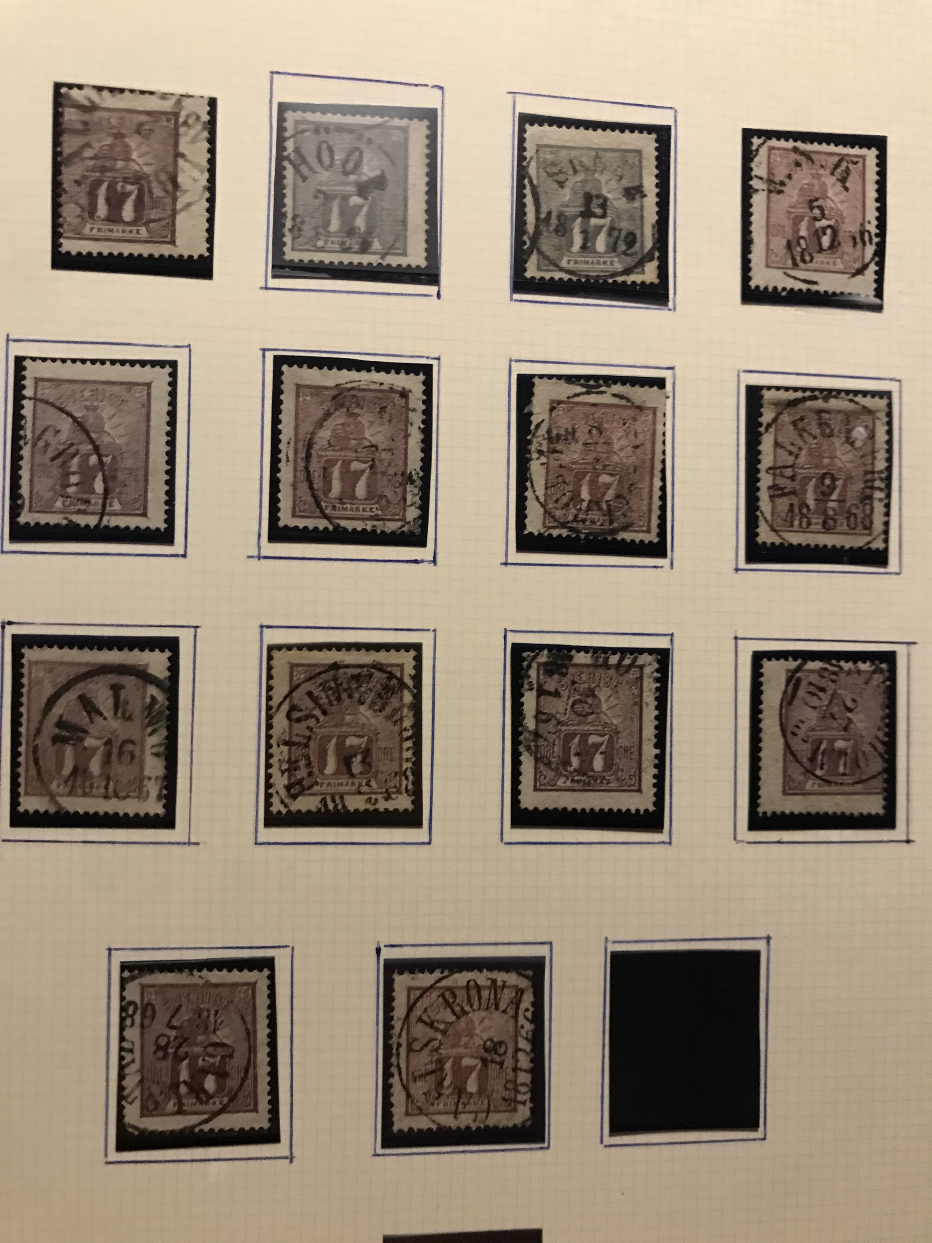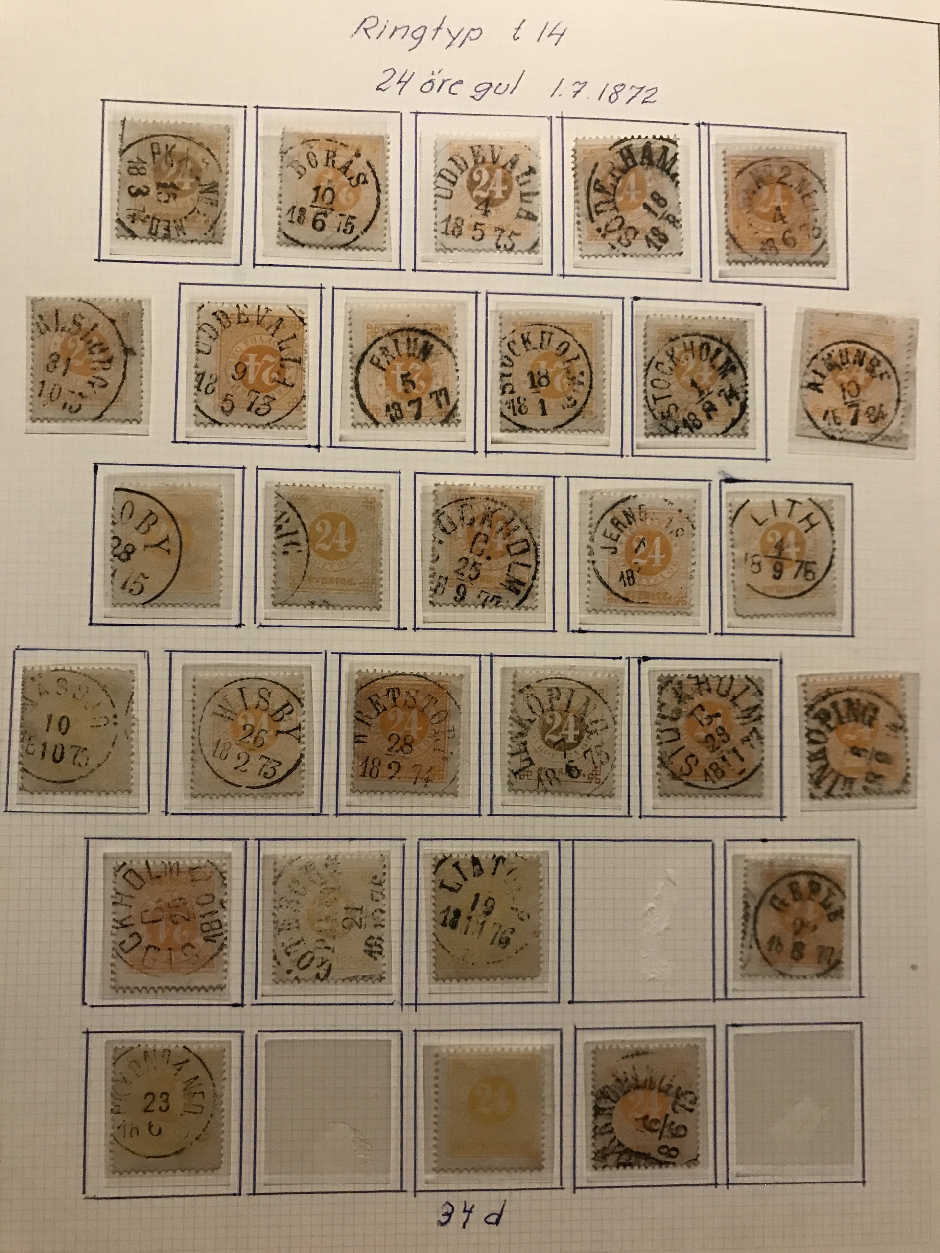 Sweden. Used. Two binders with 139 Lion types and about 2700 Circle types incl. cancellations, shades, varieties, some units and covers, etc. Containing e.g. 16 copies F15, ten F18, 49 F20, 18xF27, three F37 and 30 copies F44, etc. Very high catalouge value. Mostly fine quality. Please see a selection of scans at www.philea.se. Approx. 5 kg.
