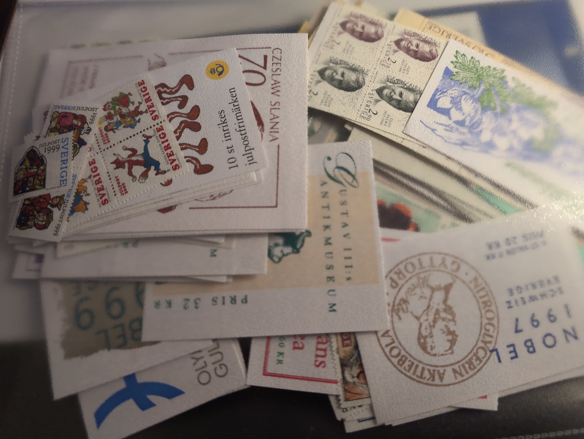 ALL WORLD. Accumulation ★★/★/⊙ 1930–1990s in small removal box. Eight stockbooks, two visir albums, booklet album and loose in bags. Much thematic stamps, some Faroe and Aaland Islands, Sweden face value 3150 SEK + four discount booklets (only Sweden) and four discount booklets (Nordic countries). Mostly fine quality. Approx. 12 kg. (1000s)