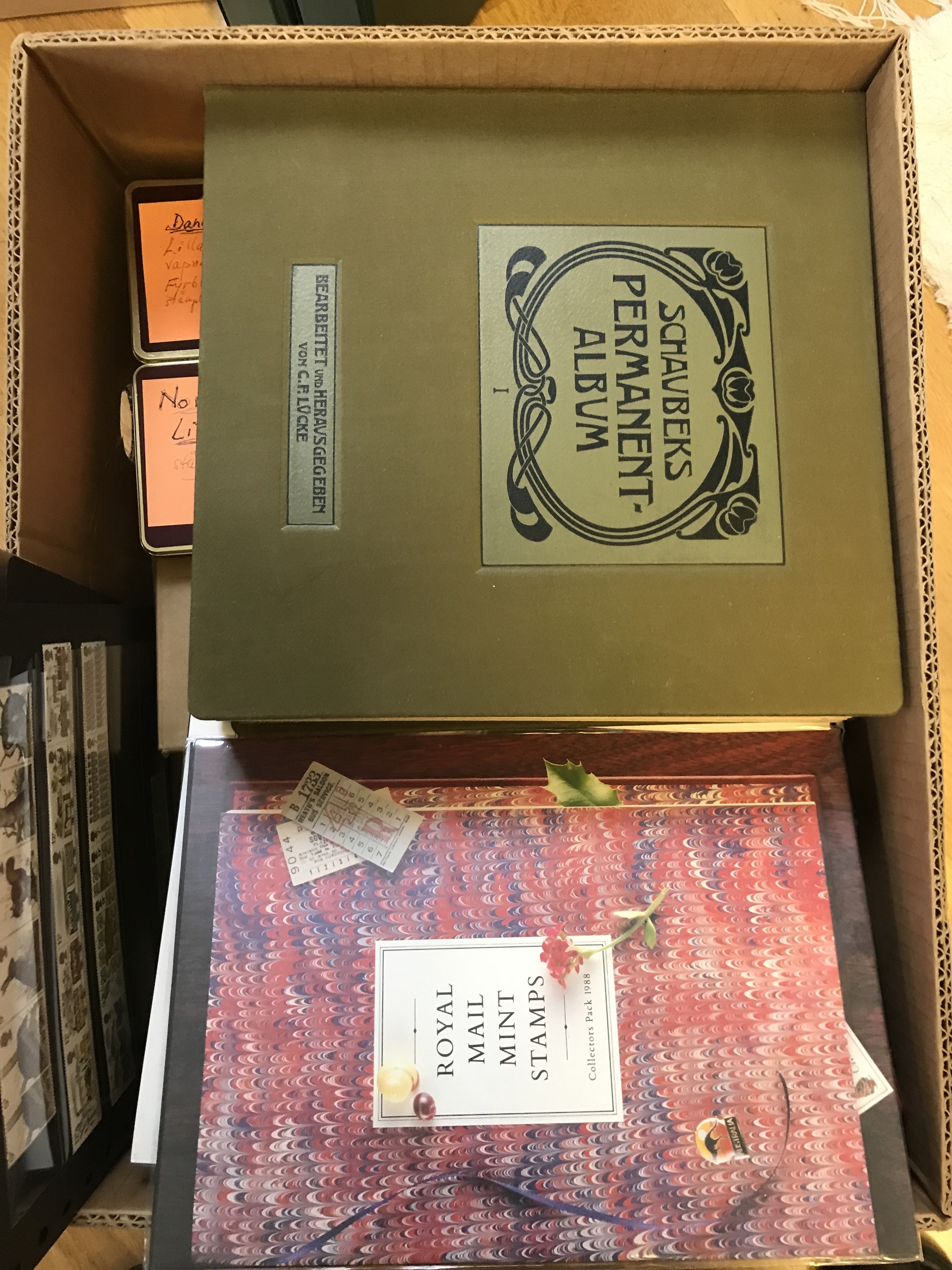 ALL WORLD. ★★/★/⊙. Interesting box with 1000s of stamps old–modern. Containing e.g. much England and Commonwealth, Chanel Islands, Scandinavia and Germany etc, several ** souvenir sheets, nice old Schaubek album, etc. Approx. 15 kg.
