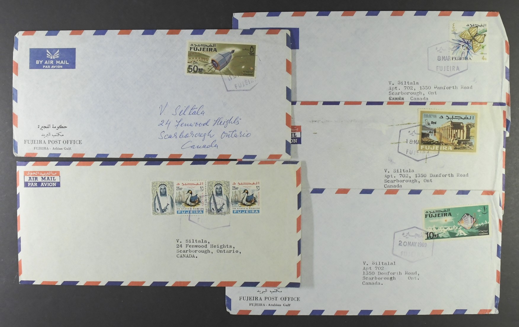 ALL WORLD, MIDDLE EAST. Lot covers 1965–1969. Trucial States. Twenty eight covers from Ajman, Fujairah and Umm Al Quwain postally sent to Canada, whereof fourteen as registered mail. Unusual material. (28)