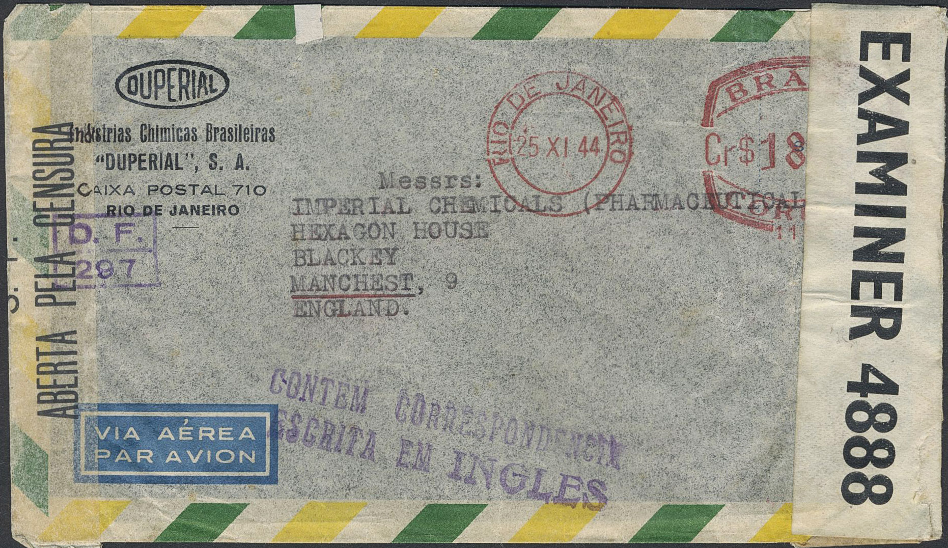 Brazil. Cover, Sent to England 1944 with postal cencor ship label affixed on the reverse "To minimise the risk of delay, letters should, whenever possible, be written in English or French".