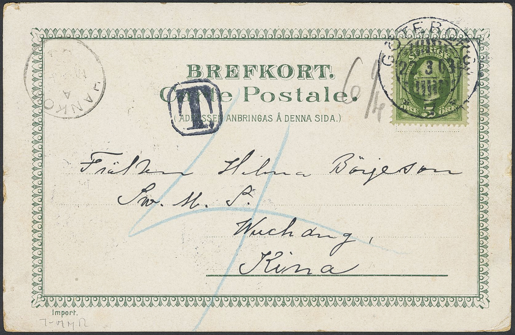 China, Incoming mail. Michel 52 on cover, Sweden. 5 öre on insufficiently paid postcard sent from GÖTEBORG 22.3.03 to Wuchang, China. Transit HANKOW A 4.MY.03. T-cancellation and postage due notations "6¼" (centimes) and "4". One of the earliest postage due items Sweden–China.