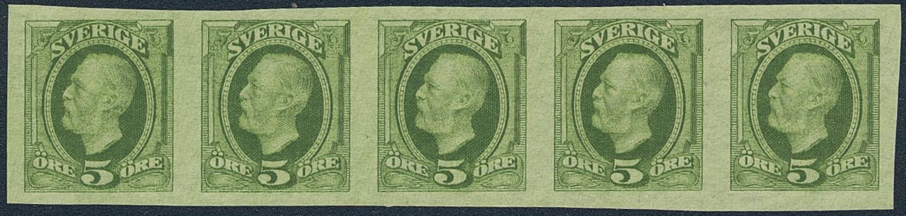 Sweden. Facit 52v1 (★), 1891 Oscar II 5 öre green imperf variety. Strip of five. SEK 20