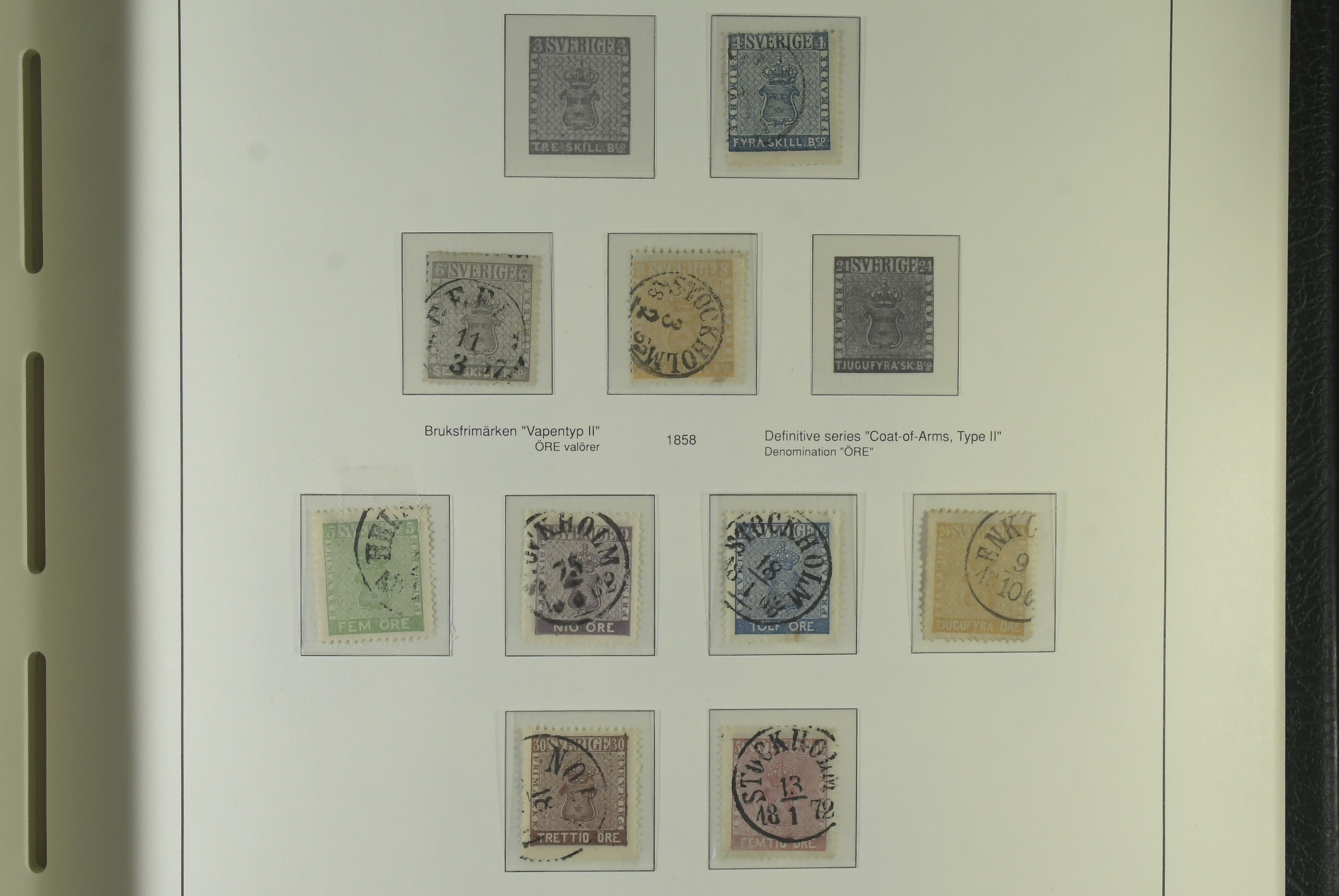 Sweden. Collection ★★/★/⊙ 1855–1969 in Leuchtturm album with stamp mounts. With 4, 6 and 8 sk, Coat-of-arms complete, 17 öre Grey Lying lion, Landstorm II *, UPU Congress and UPU Union complete **. later years a little bit sparse. Please see a selection of scans at www.philea.se. Mostly fine quality.