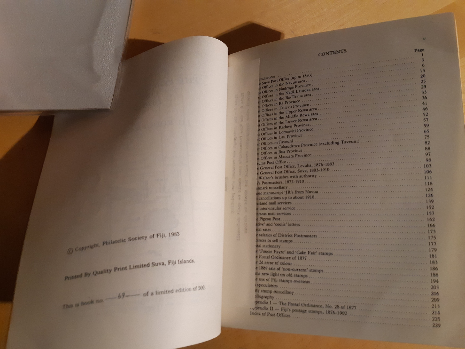 Literature. Rodger, J.G., 'The Postal History of Fiji 1876–1910', Philatelic Society of Fiji 1983, vii + 230 pages + maps + plates, limited edition, No. 69 of 500 copies. Used.