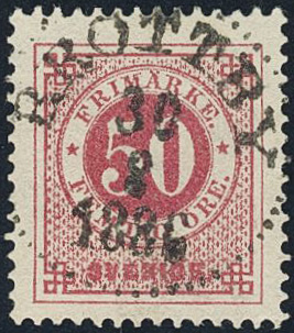 Sweden. Facit 36g used, 50 öre carmine-red on soft paper. EXCELLENT cancellation BROTTBY 30.2.1886.