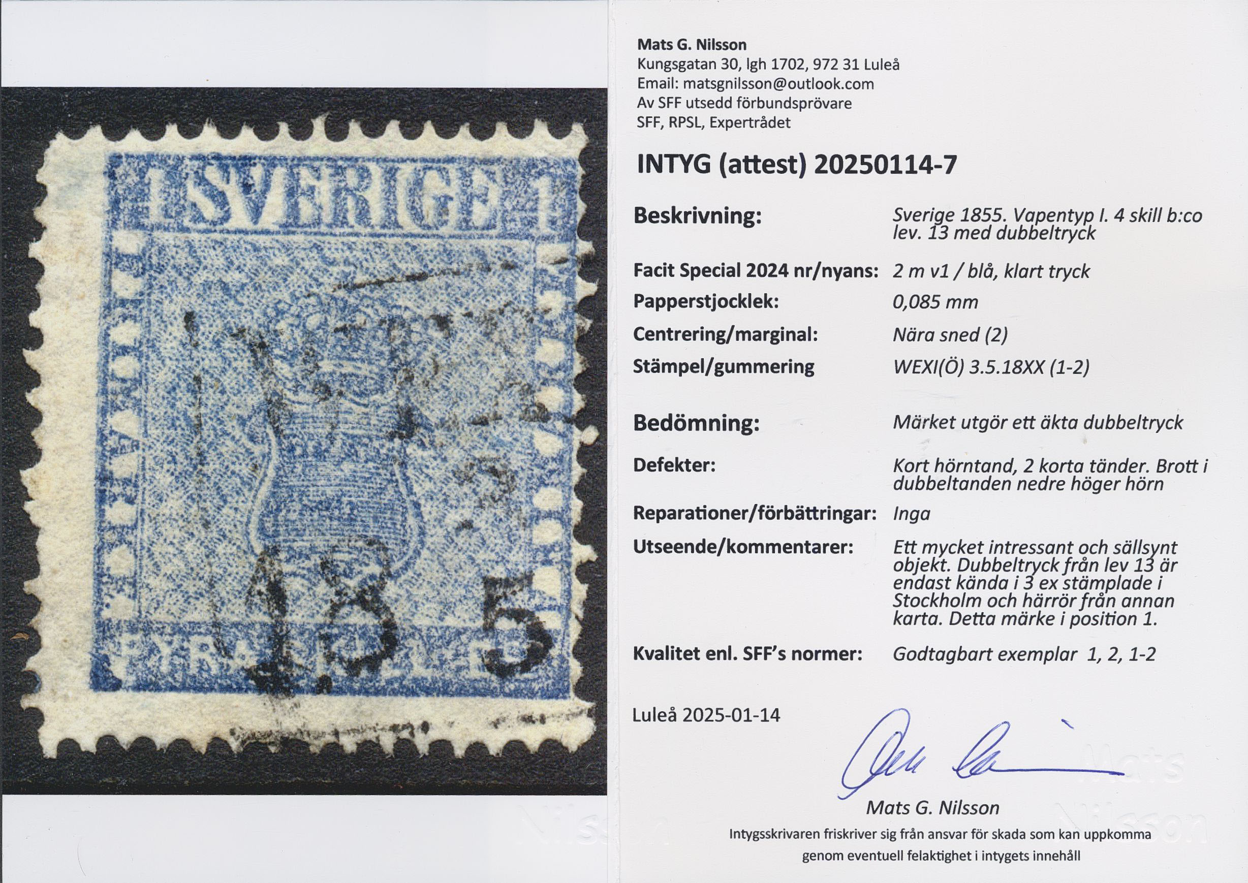 Sweden. Facit 2m v1 used, 4 skill blue, DOUBLE PRINT variety. Very interesting and scarce item. Double prints from delivery 13 are known in three copies used in Stockholm, plus this example used in WEXI(Ö) 3.5.18xx. Certificte M. Nilsson 1, 2, 1–2 (2025). Ex. Contenta.